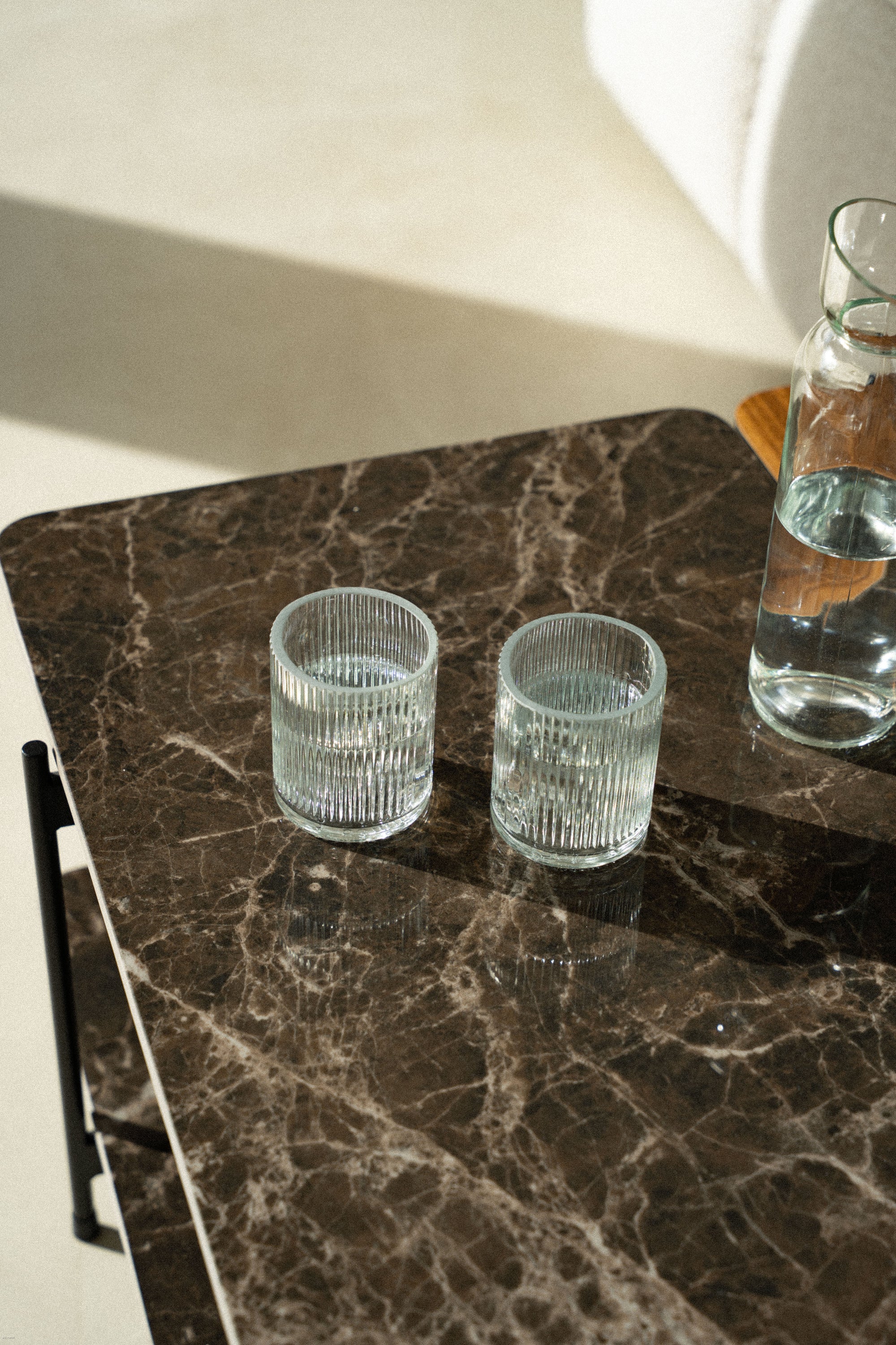Verres très élégants sur une table. J'aime beaucoup moins les transparents qui font a penser à des pots de yaourt. Donc je n'en prendrais plus. Mais les fumés marrons sont très jolis