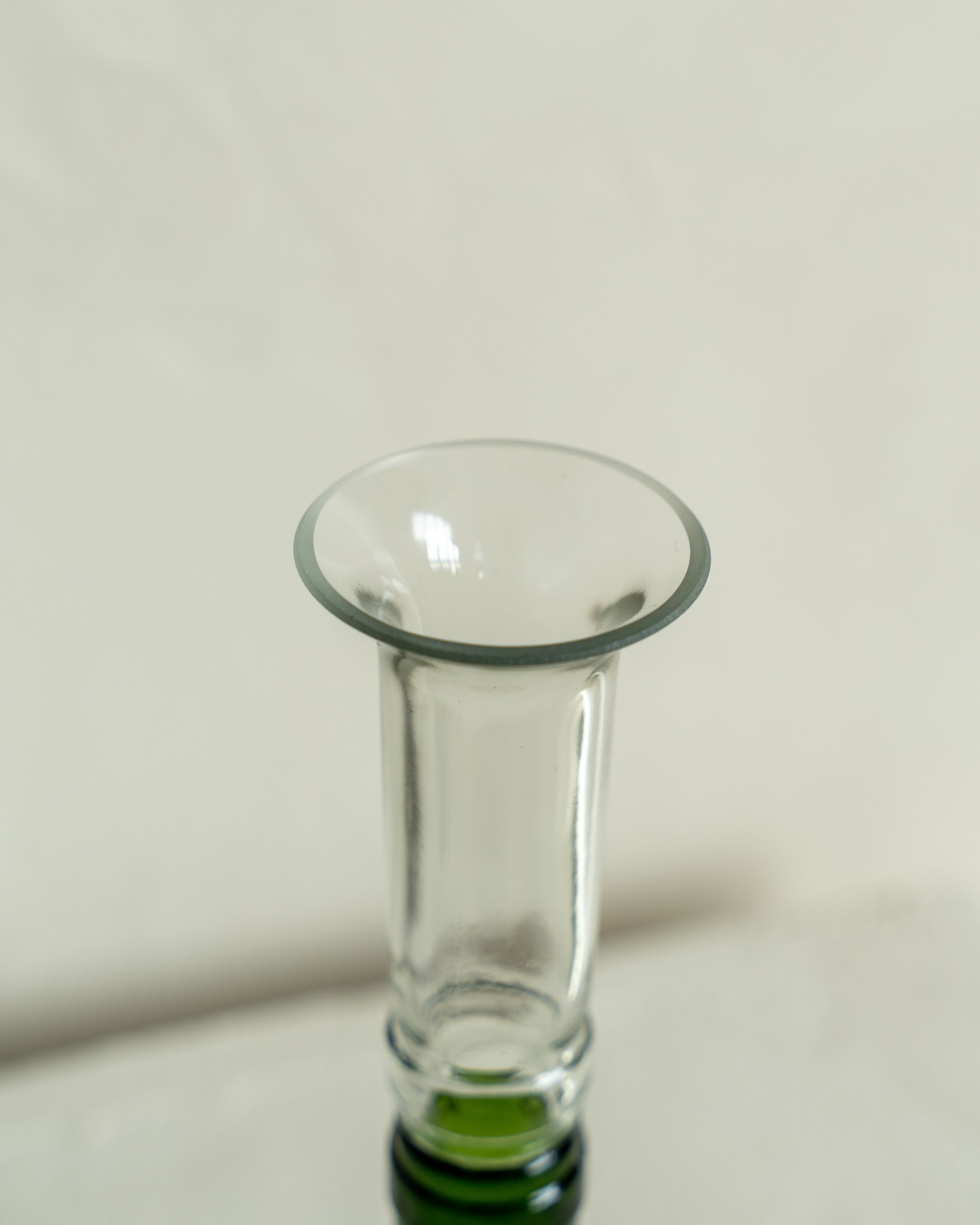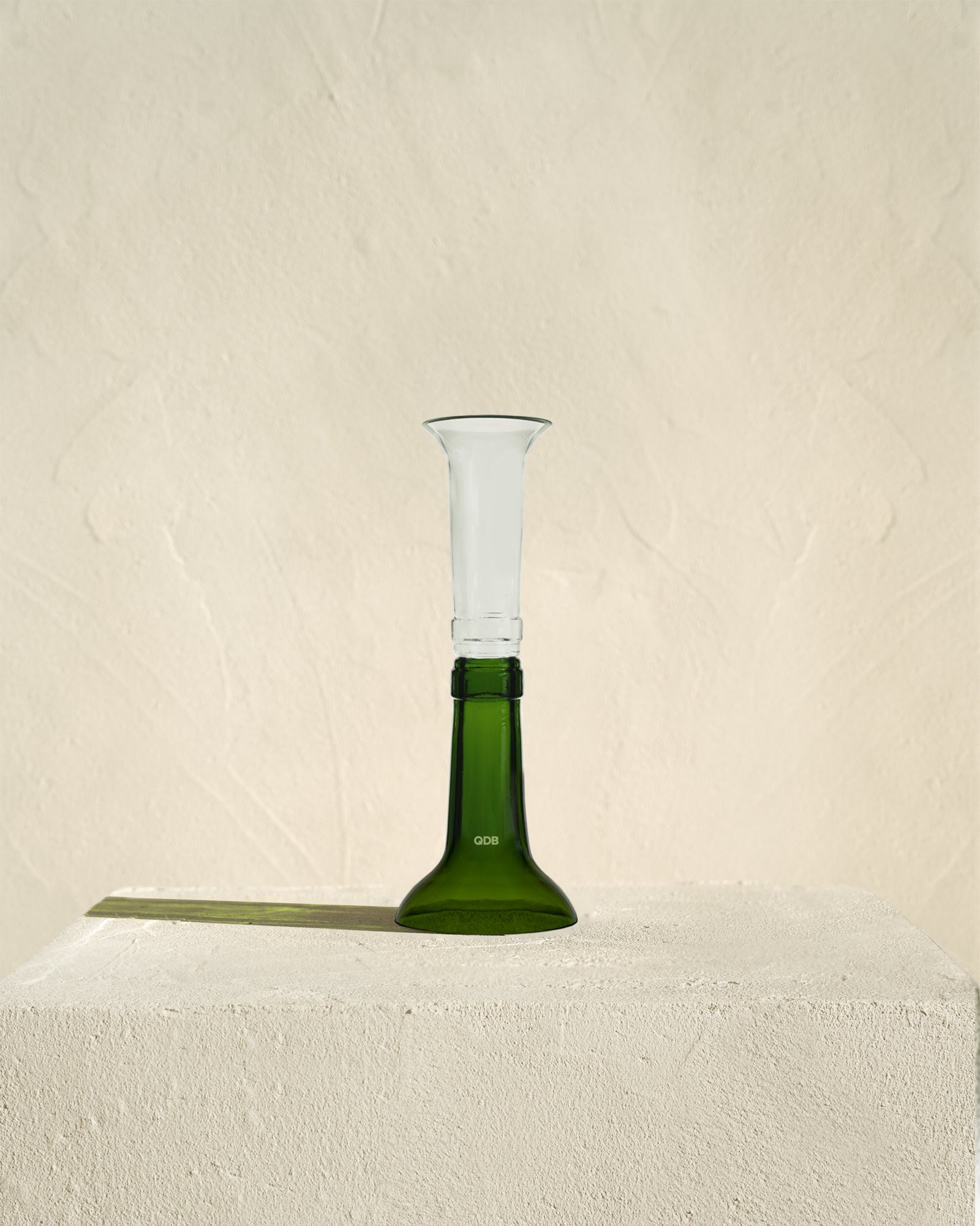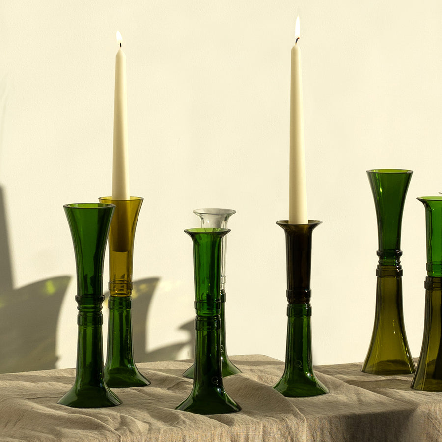 In this new edition, the candlestick is reinvented, renewed, and soaring. Developed in a tall version, it emerges from the meeting of two wine or champagne bottle necks. Available in several variations, the shapes and shades combine freely for a table setting full of character, responsible, and resolutely elegant.