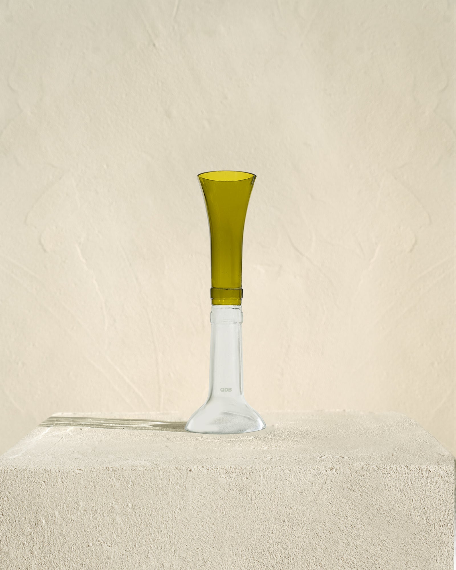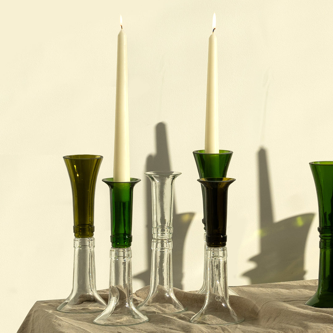 In this new edition, the candlestick is reinvented, renewed, and soaring. Developed in a tall version, it emerges from the meeting of two wine or champagne bottle necks. Available in several variations, the shapes and shades combine freely for a table setting full of character, responsible, and resolutely elegant.