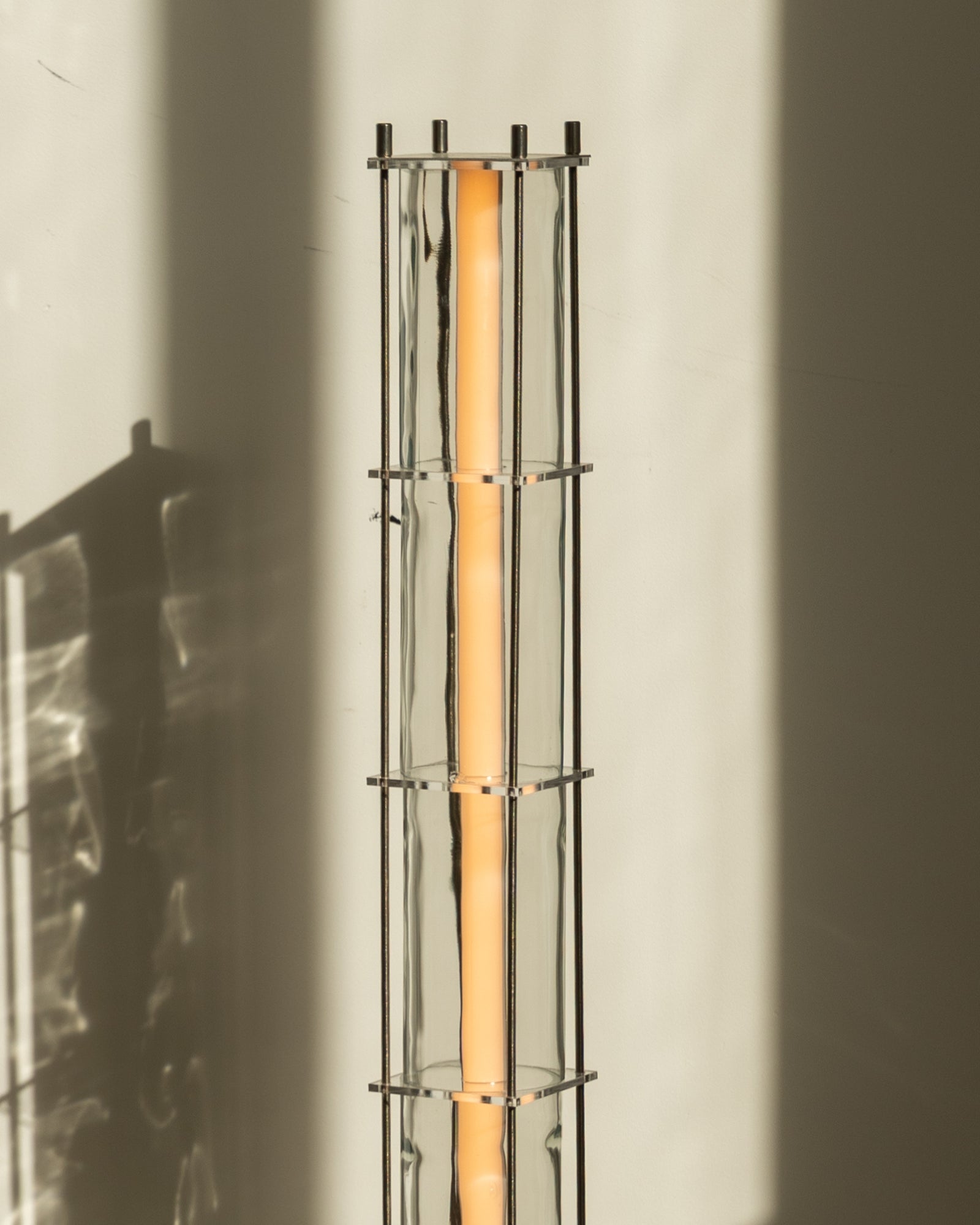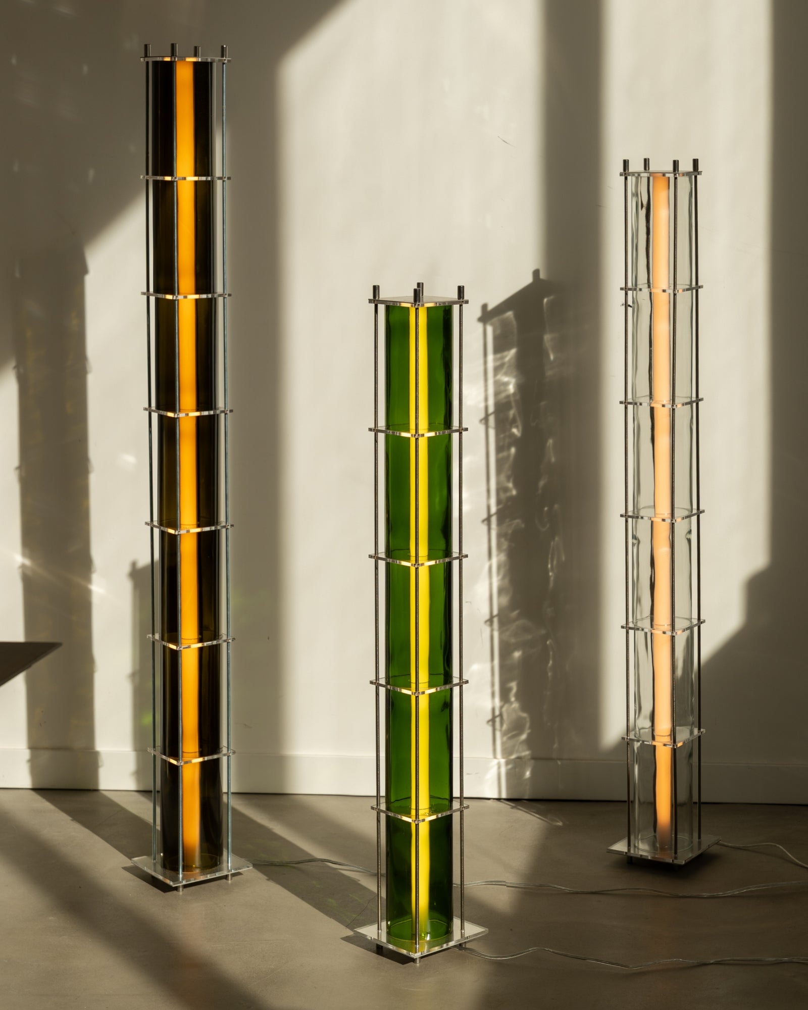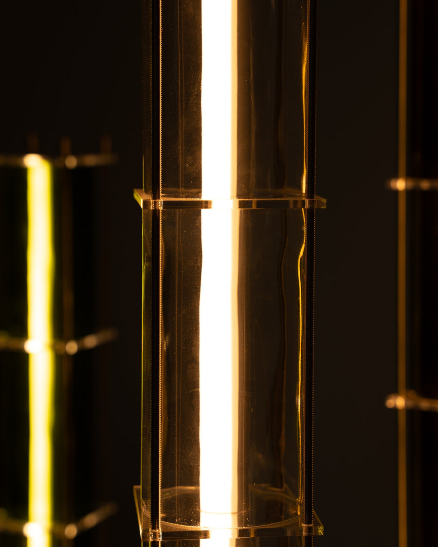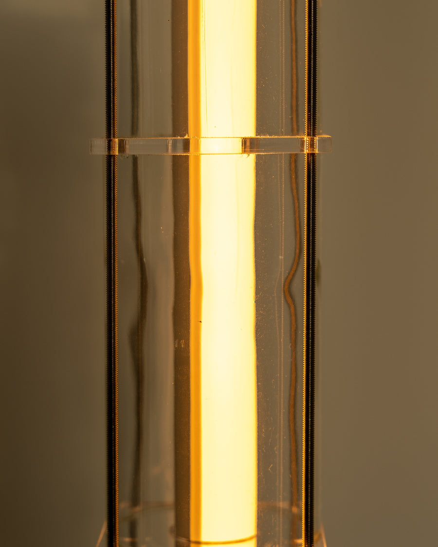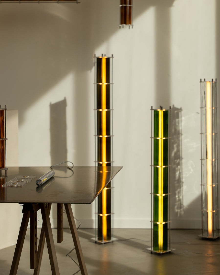 The CYL collection floor lamp is a creation born from the encounter between the artisanal know-how of QDB Éditions and the creativity of designer Théo Charasse. It is composed of glass cylinders from magnums of rosé cut and shaped in the workshop, combined with plexiglass plates and an LED tube diffusing a soft and warm light. Equipped with a transparent cable as well as a switch to adjust the light intensity.