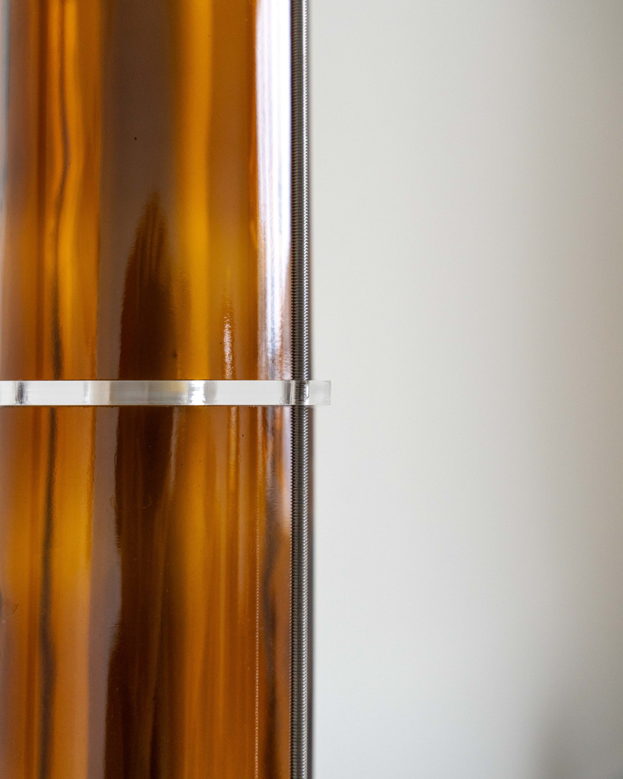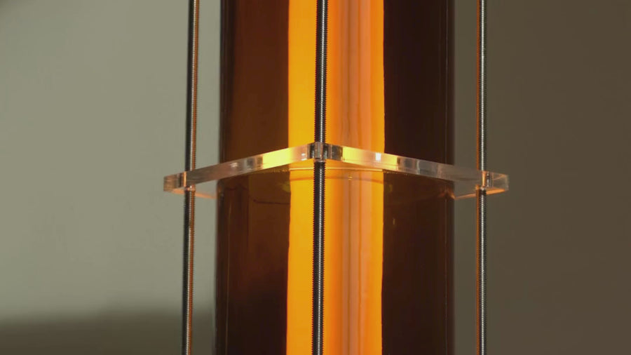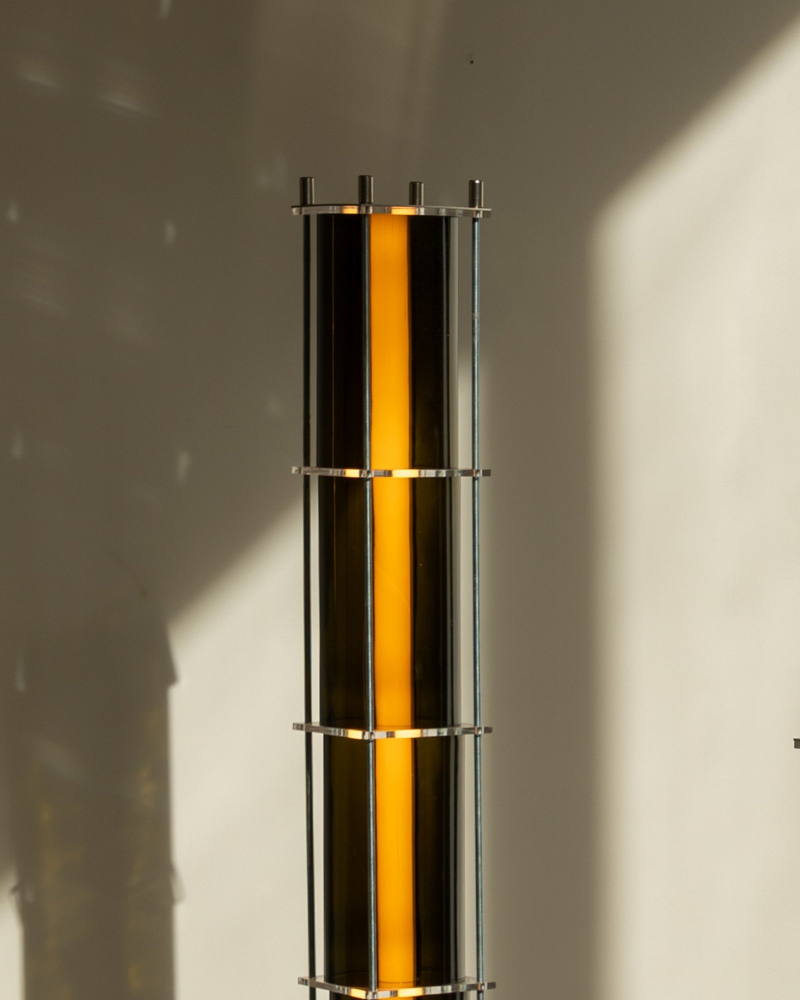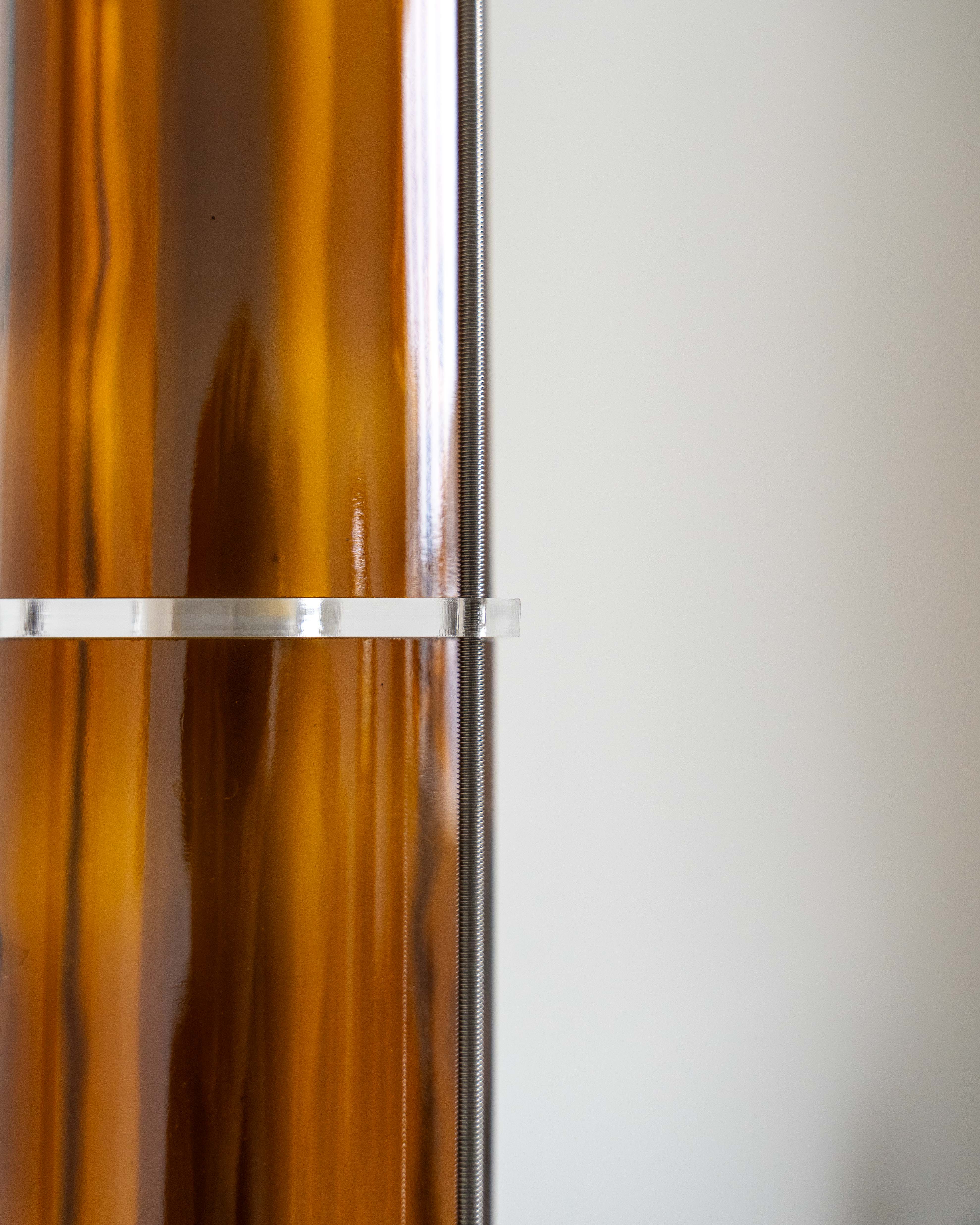 The floor lamp from the CYL collection is a creation born from the encounter between the artisanal know-how of QDB Éditions and the creativity of designer Théo Charasse. It is composed of glass cylinders from magnums cut and shaped in the workshop, combined with plexiglass plates and an LED tube diffusing a soft and warm light. Equipped with a transparent cable as well as a switch to adjust the light intensity.