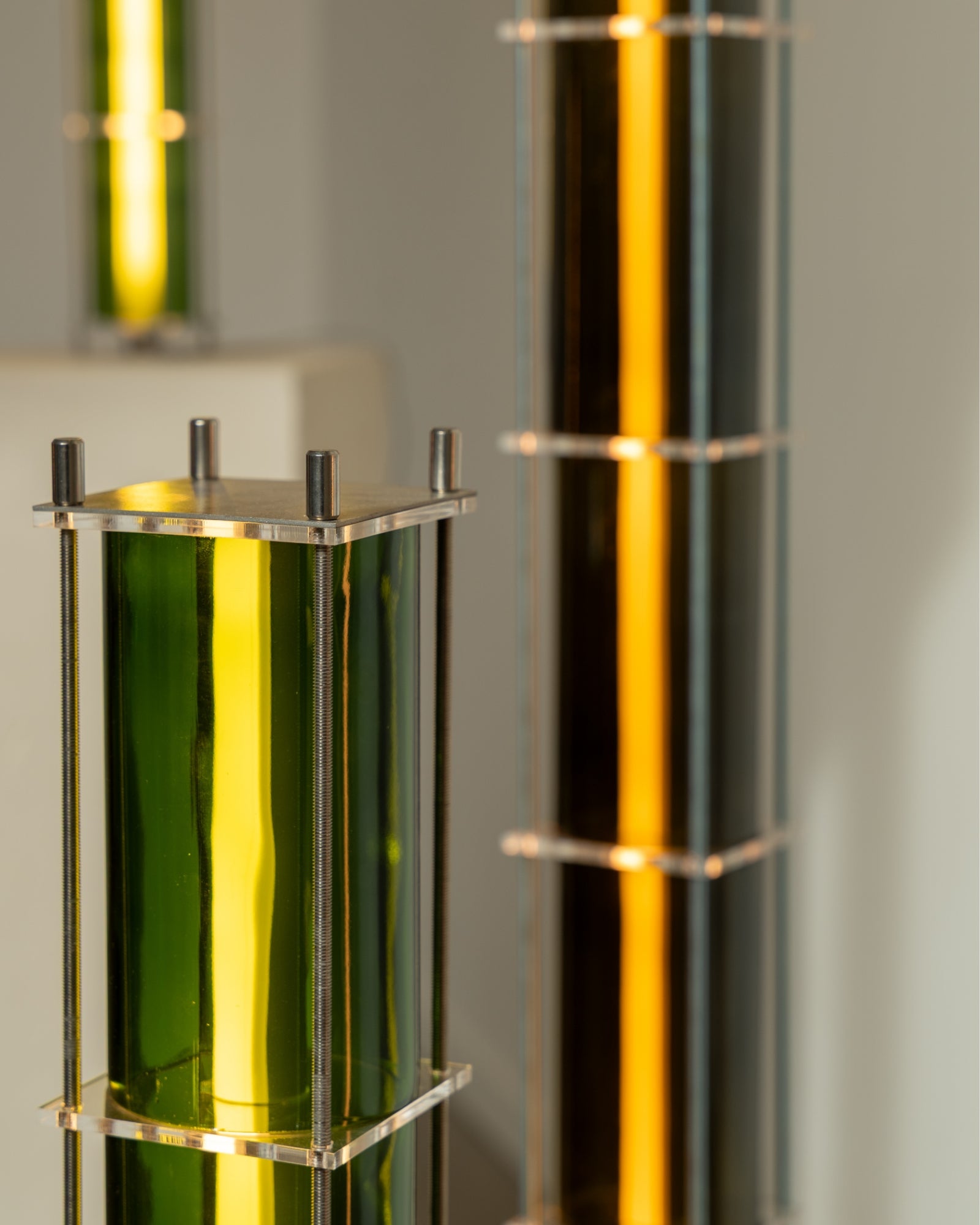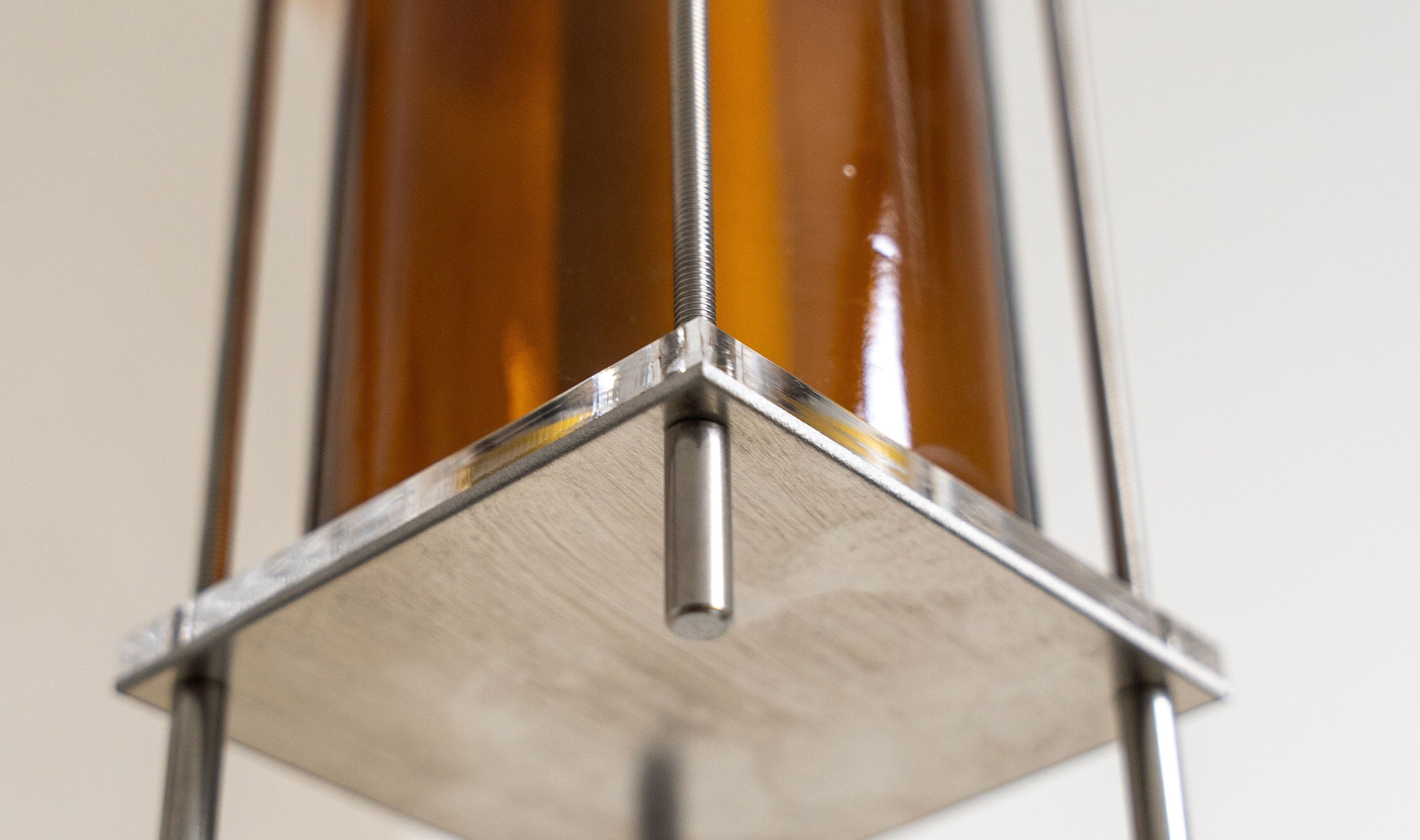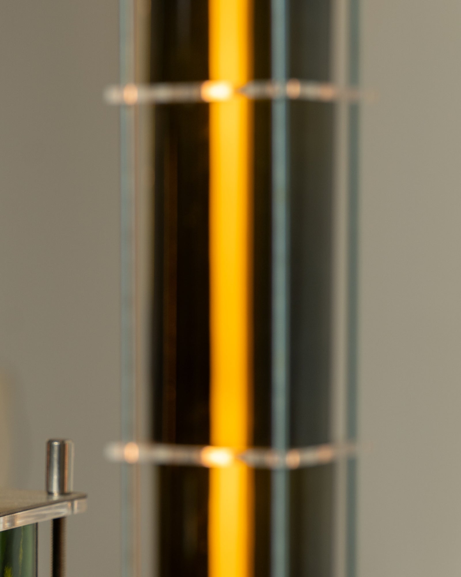 The floor lamp from the CYL collection is a creation born from the encounter between the artisanal know-how of QDB Éditions and the creativity of designer Théo Charasse. It is composed of glass cylinders from magnums cut and shaped in the workshop, combined with plexiglass plates and an LED tube diffusing a soft and warm light. Equipped with a transparent cable as well as a switch to adjust the light intensity.