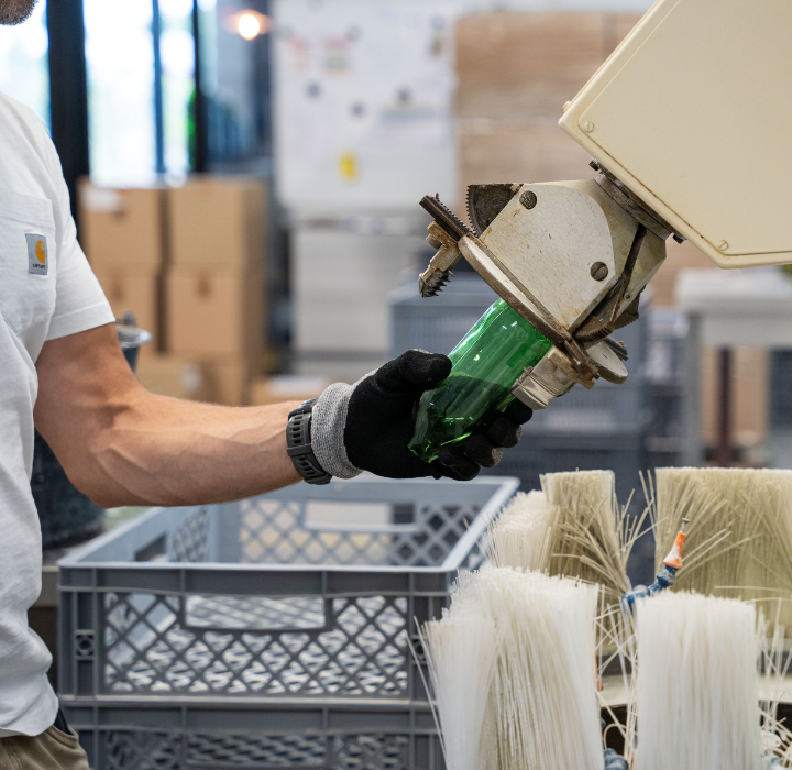The bottle is cut into cylinders which are superimposed and the natural constraints of the material are confronted to better push them back.