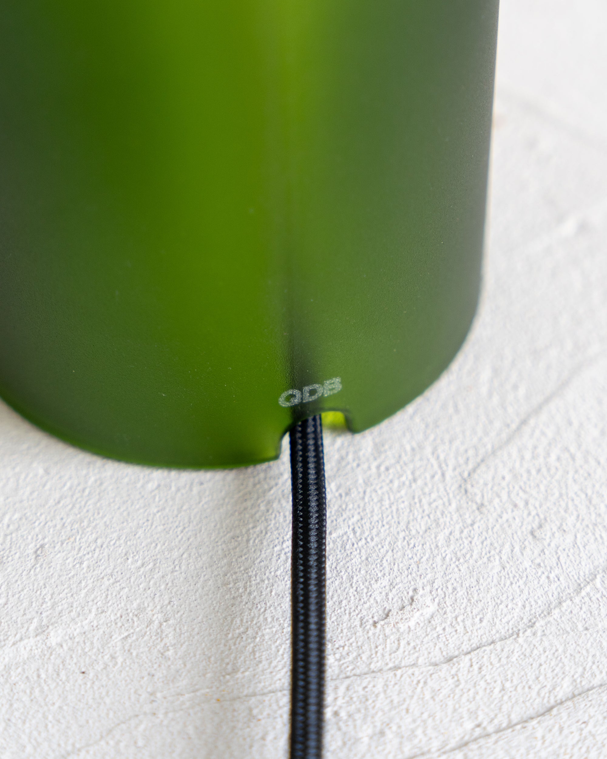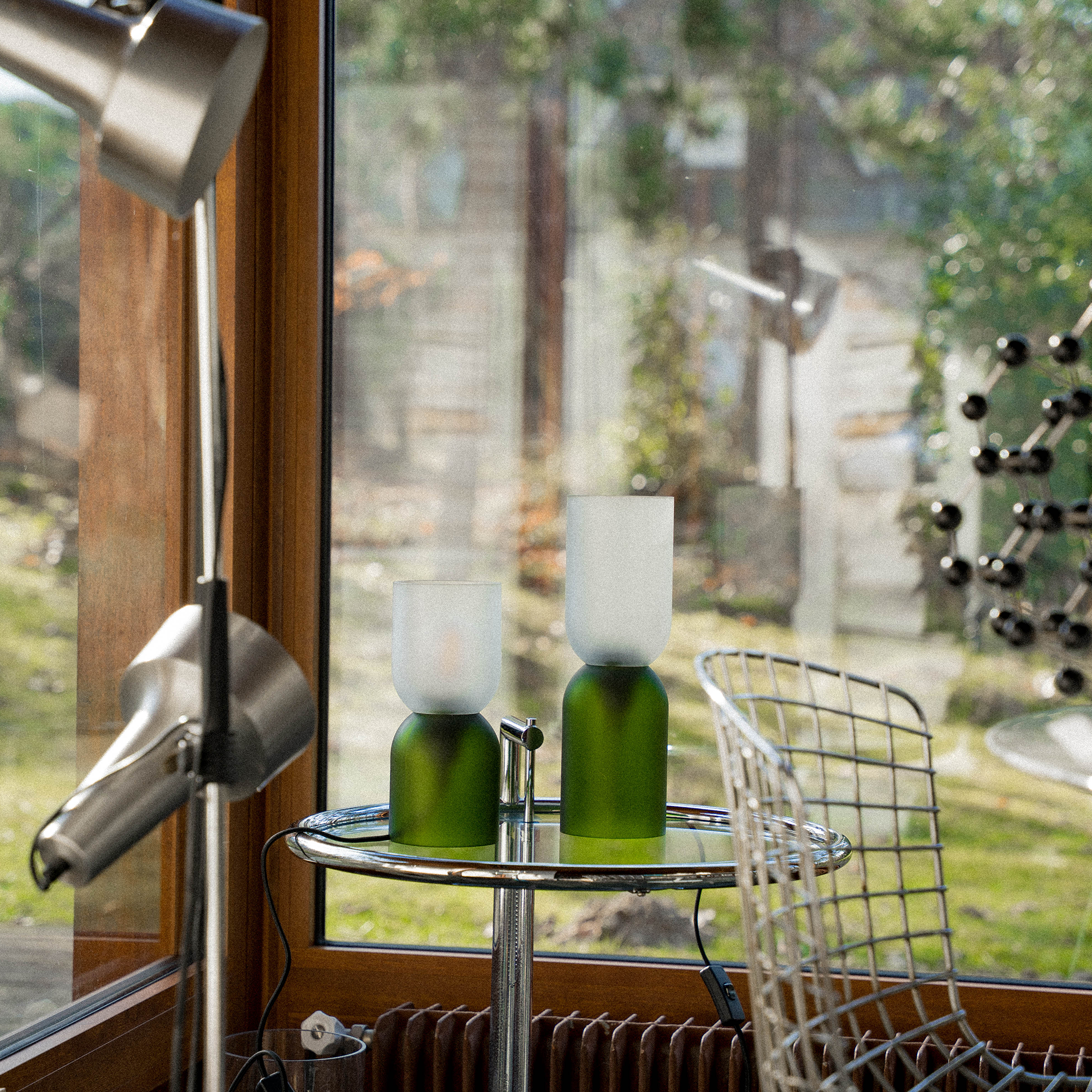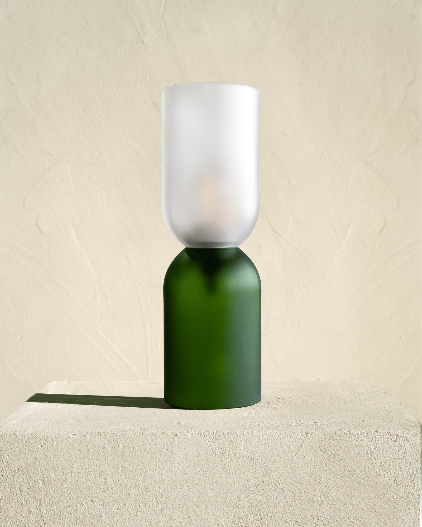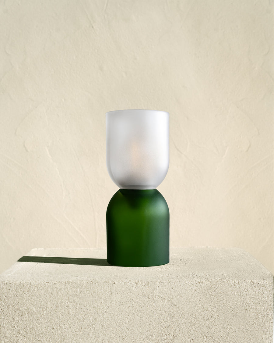Available in 4 models, the Q de Bouteilles table lamp comes to life in interiors. Versatile, it can be used as a bedside lamp, a desk lamp, or placed in the living room. Beneath its apparent simplicity, this first edition is born from meticulous gestures. Shaped from the shoulder of magnums of wine then assembled by the neck, it takes the form of a two-tone hourglass. Sandblasted on the outside, its bells illuminate with a subdued light; baked in the oven, they offer a satin finish.