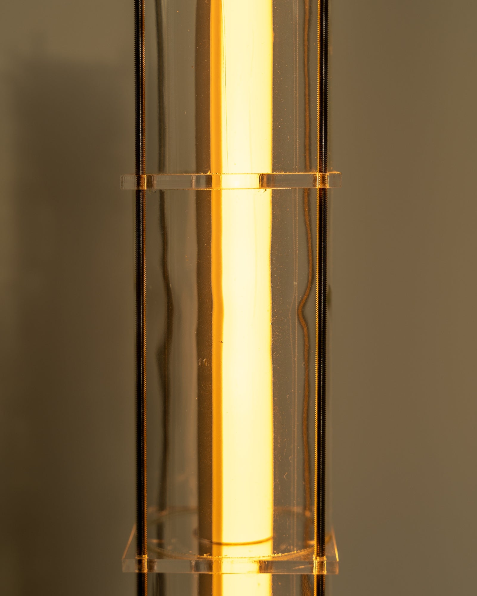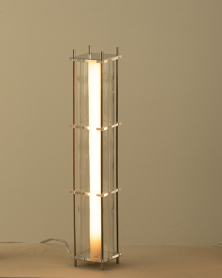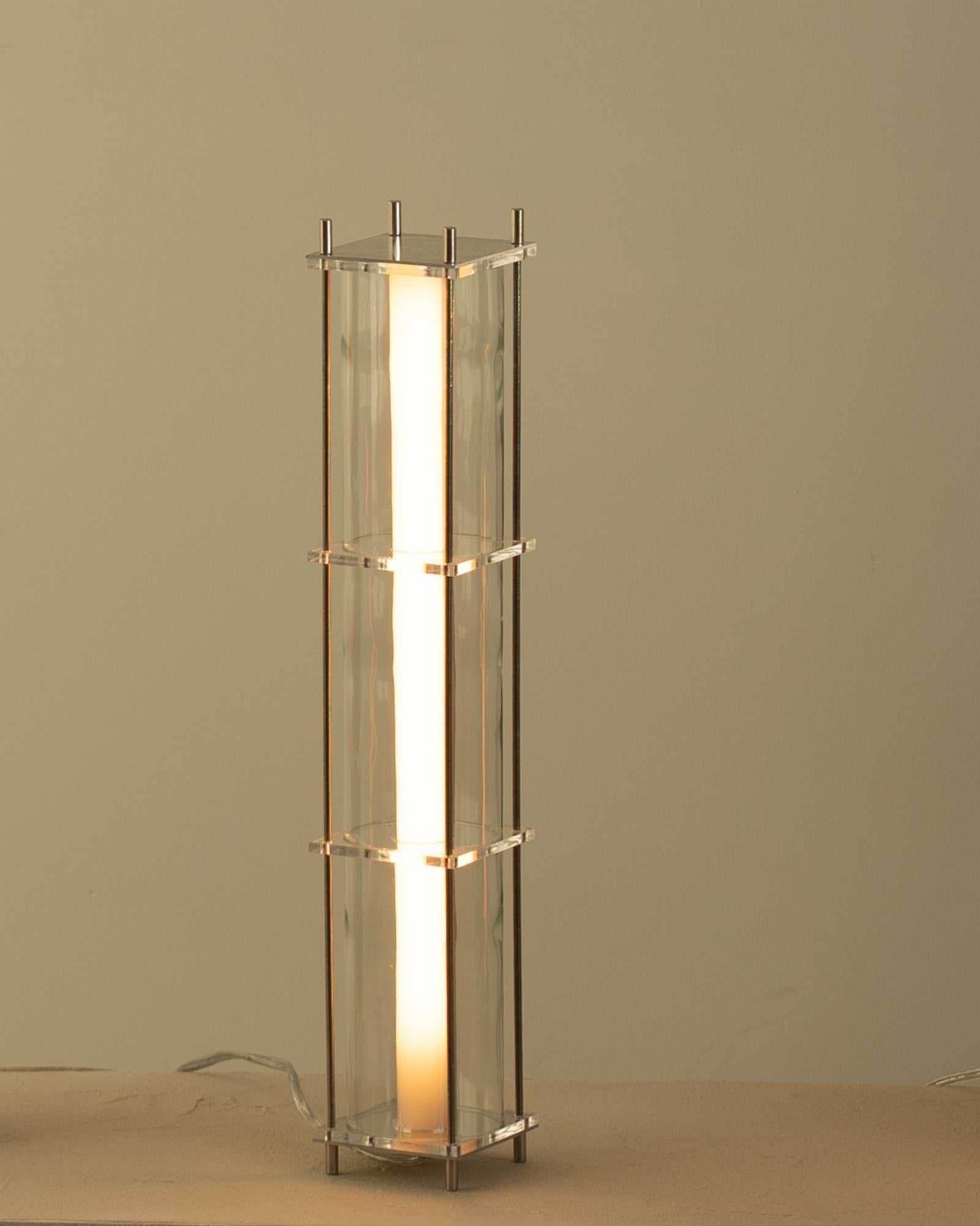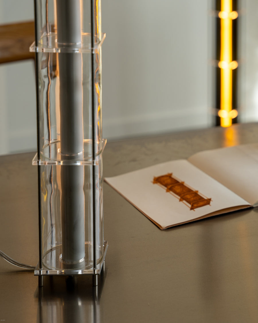 It is made up of glass cylinders from rosé bottles cut and shaped in the workshop, combined with plexiglass plates and an LED tube diffusing a soft, warm light.
