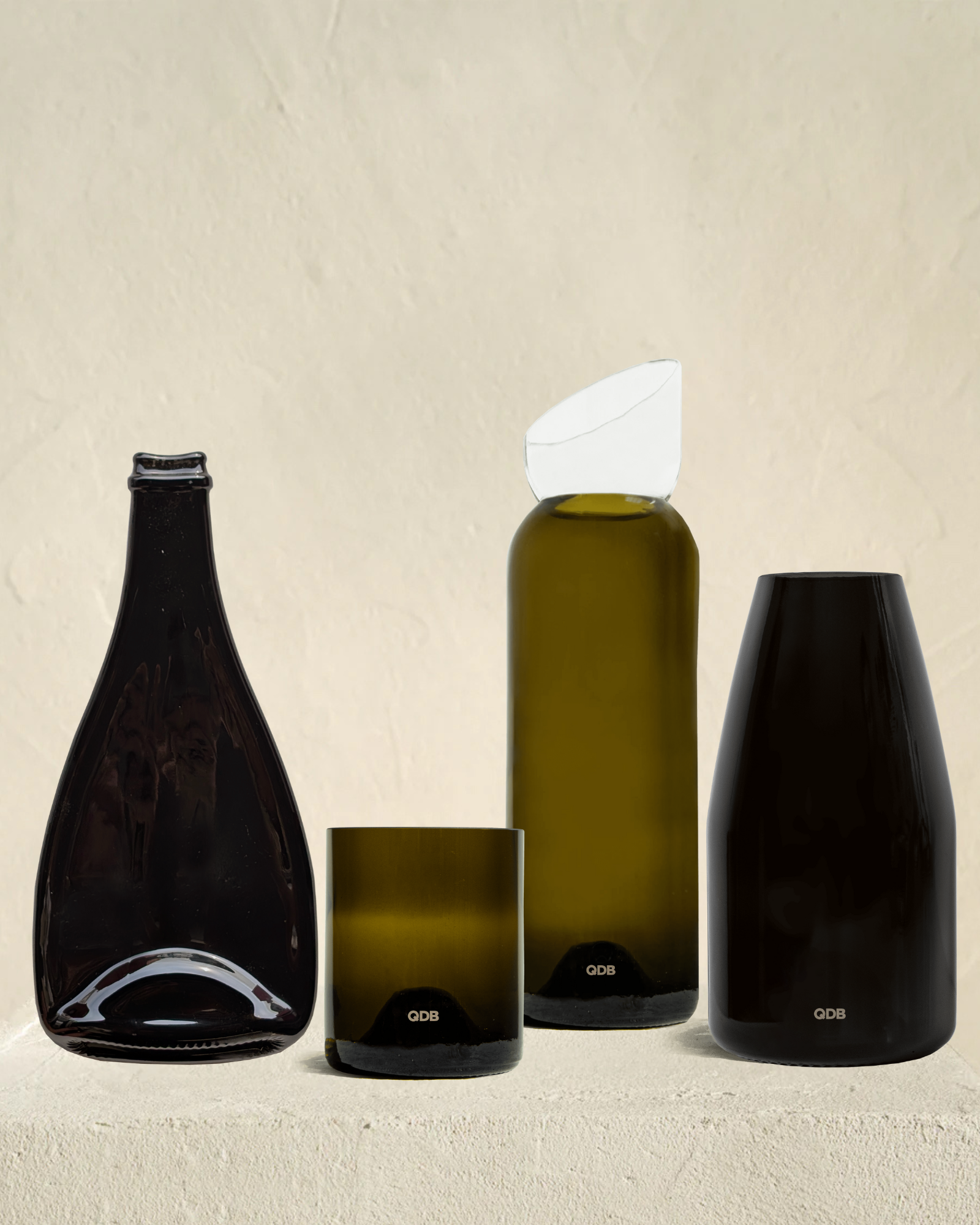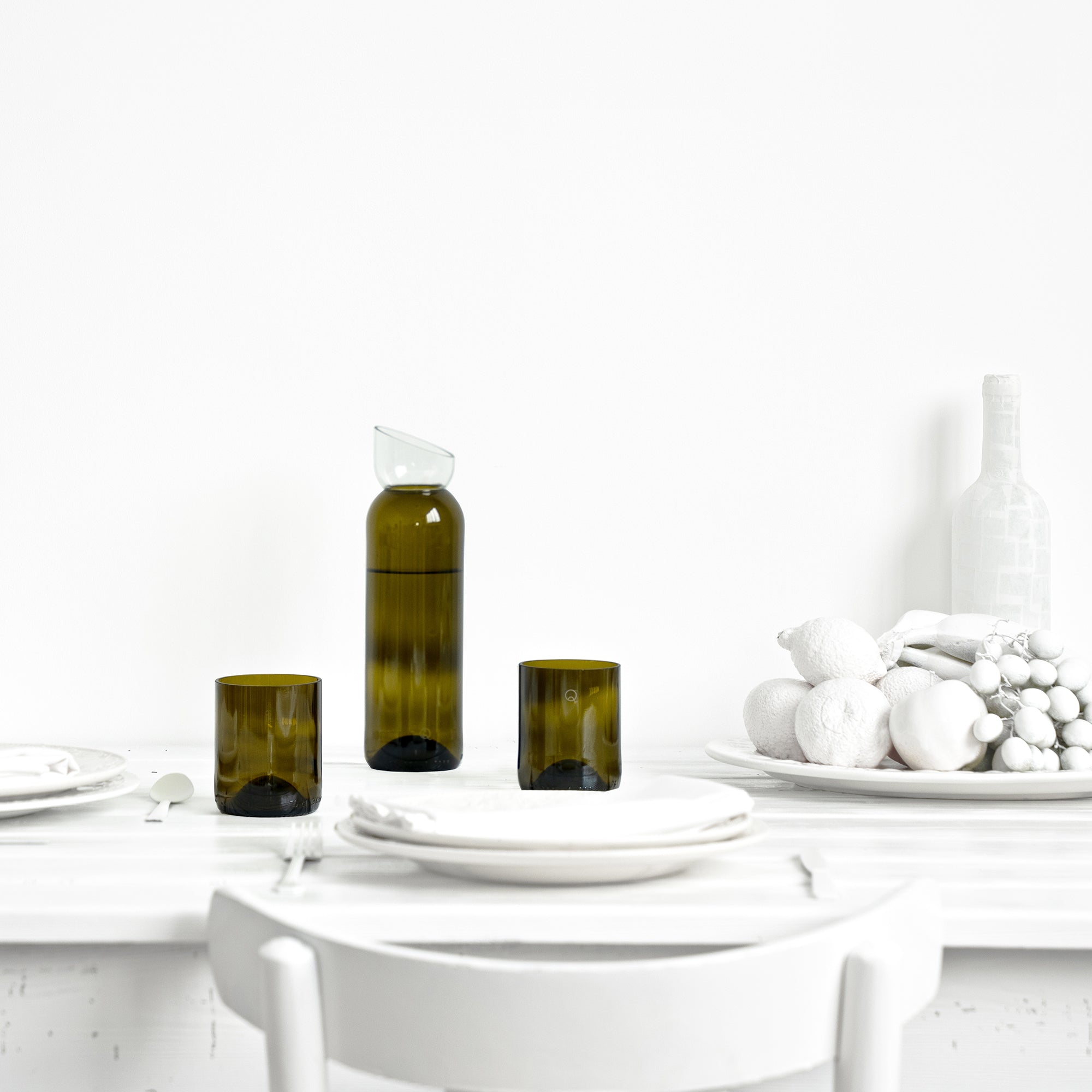 The glasses and the carafe, meanwhile, are fashioned from Bordeaux-style bottles, which are straight, thinner and lighter.