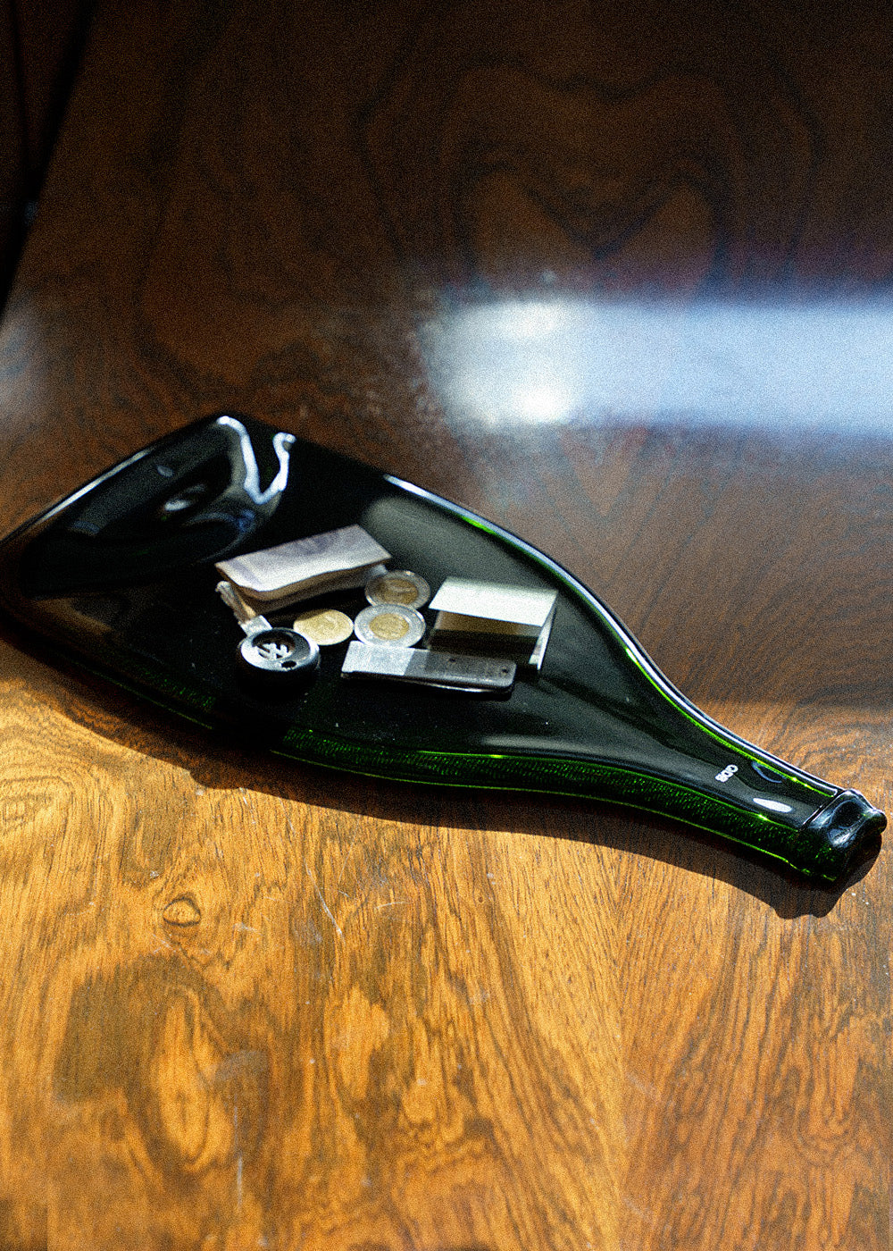 The appetizer board transforms the material and history of a wine bottle into an elegant piece of table art.