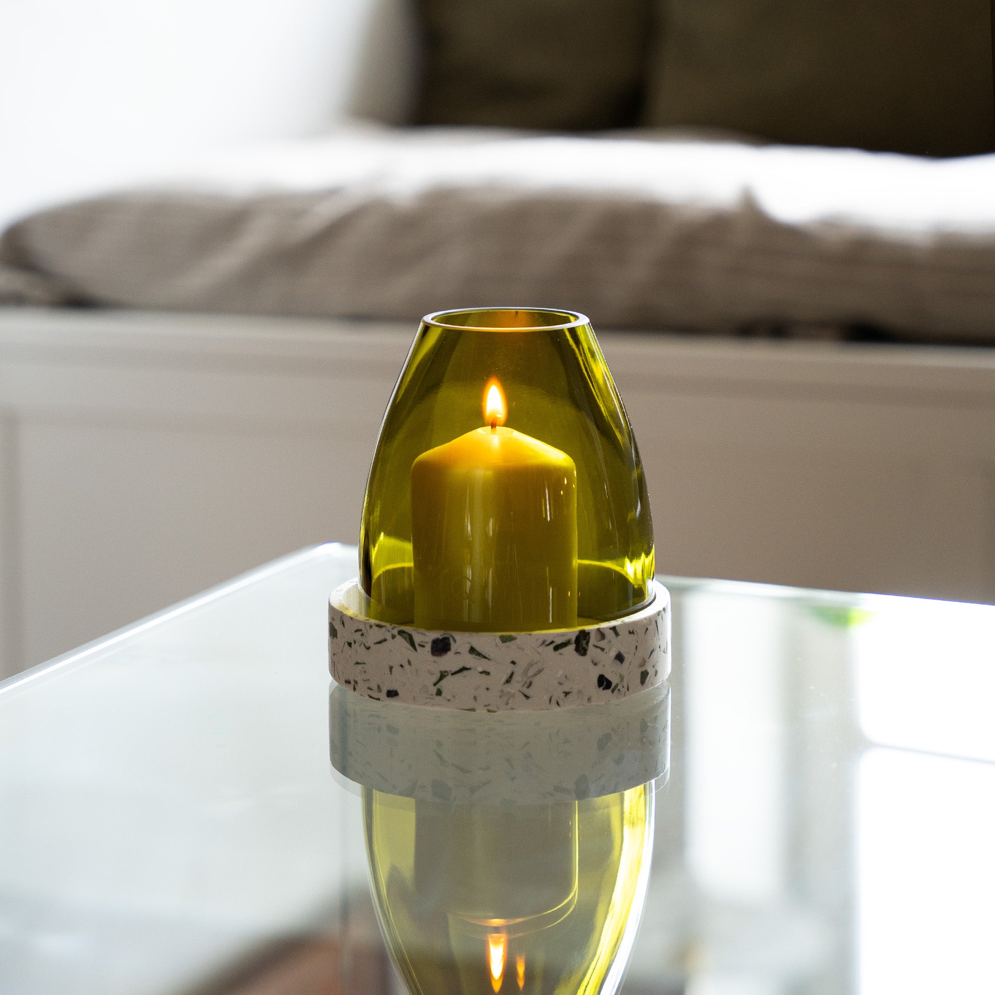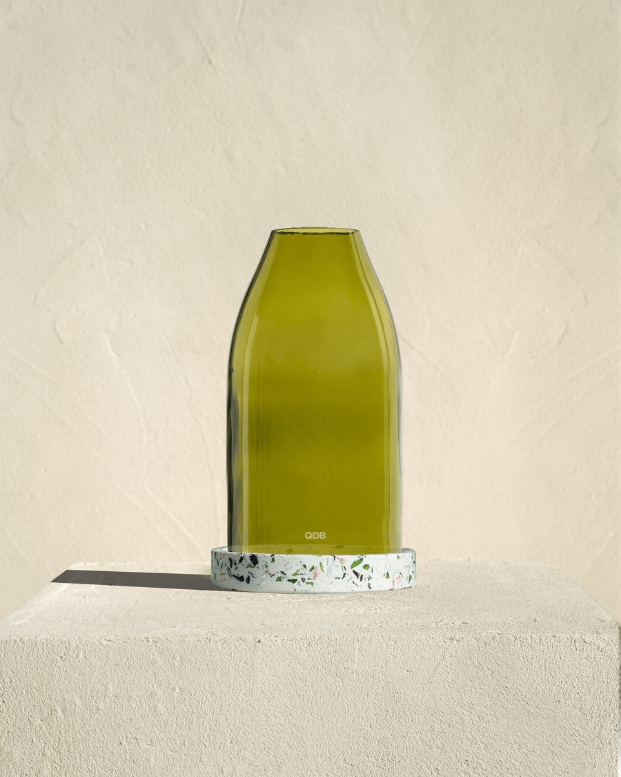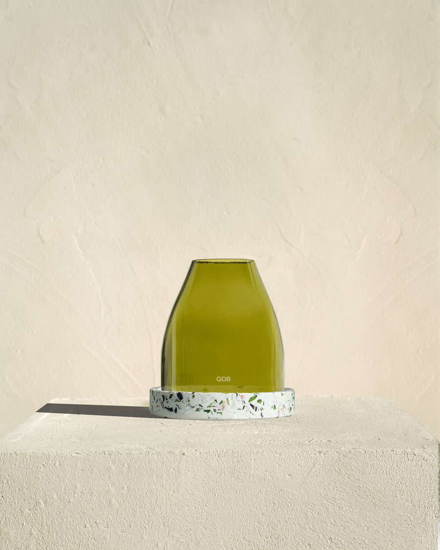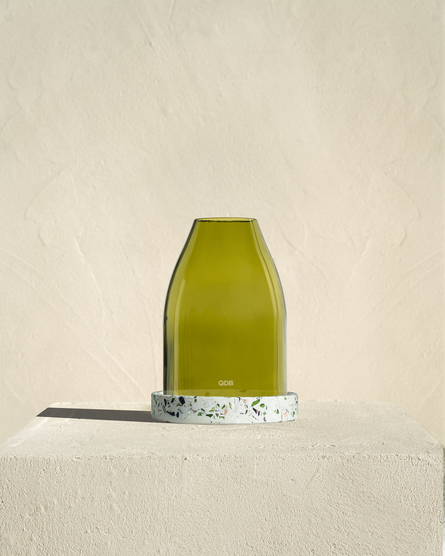 The glass bell jar is made from a magnum, showcasing the beauty of raw, recycled glass.