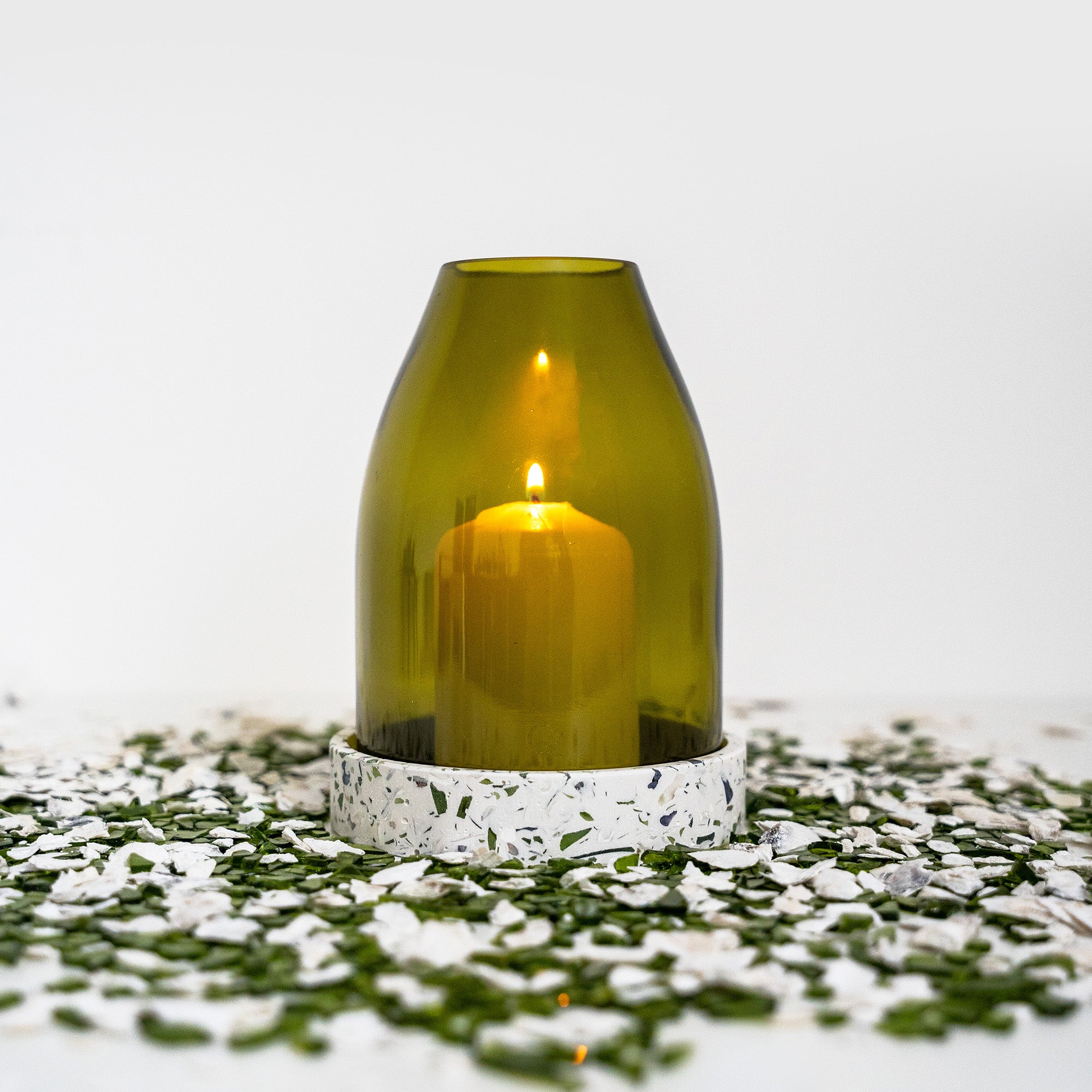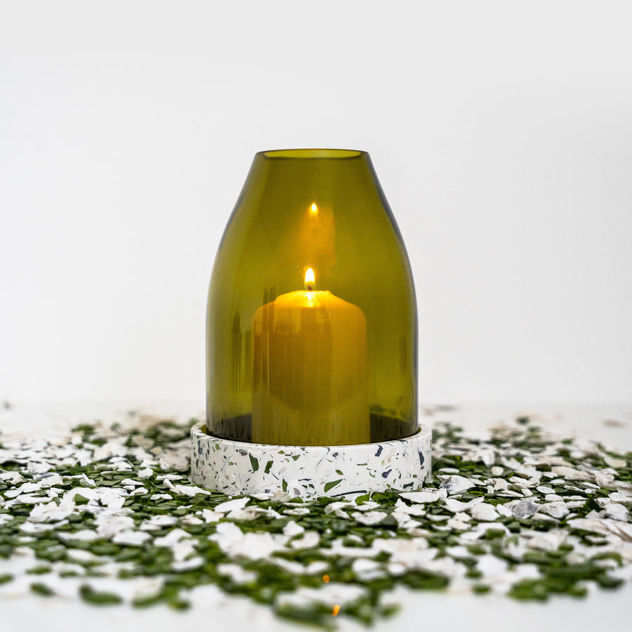 To make the base of the candle holder, Malàkio incorporates crushed glass from product scraps and oyster shells.