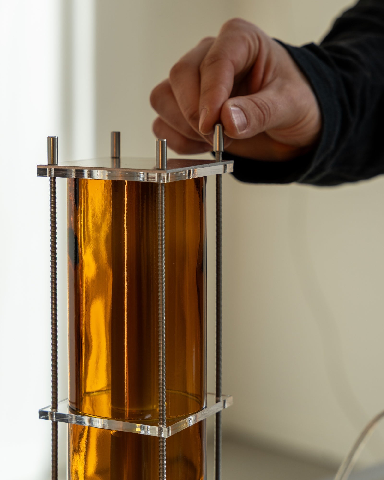 It is made up of glass cylinders from beer bottles cut and shaped in the workshop, combined with plexiglass plates and an LED tube diffusing a soft, warm light.