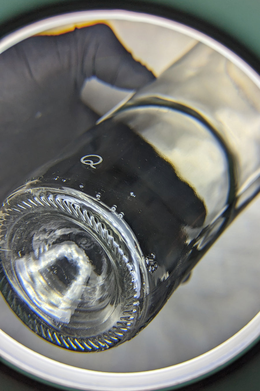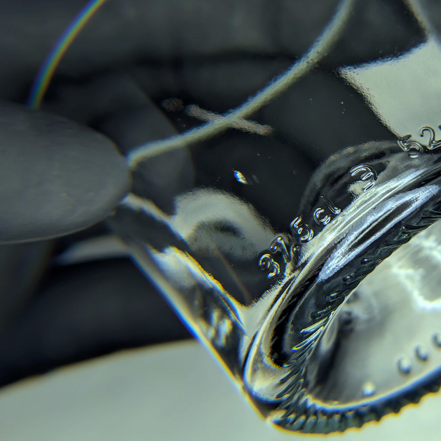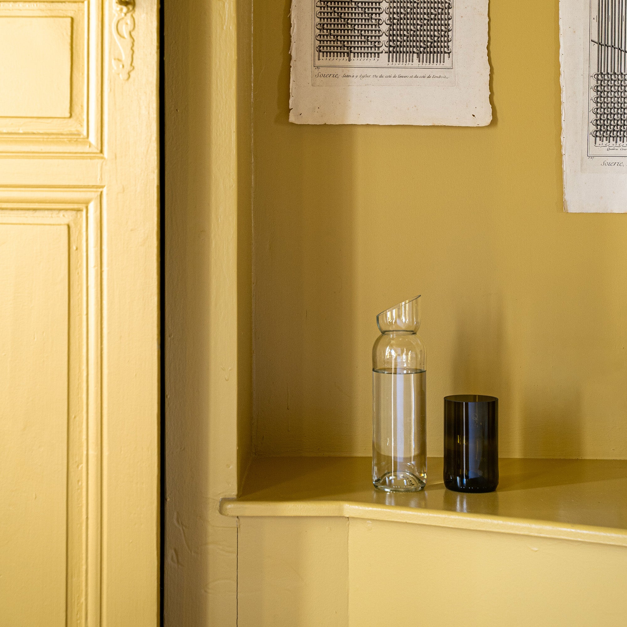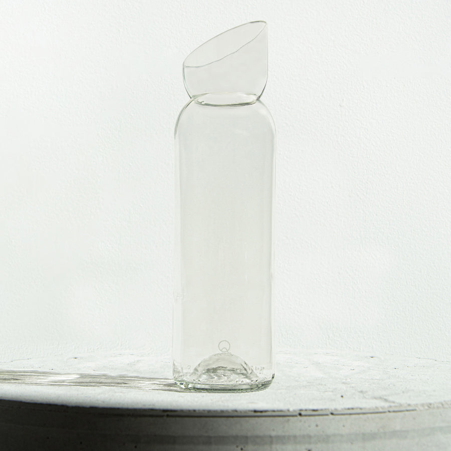 Carafe à bec biseau qui fait rencontrer le vert de la bouteille de bordeaux et le transparent de la bouteille de rosé.