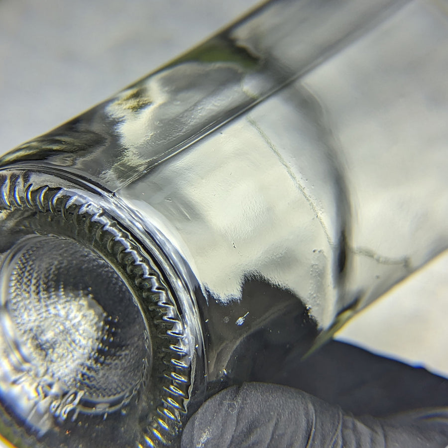 Carafe à bec biseau qui fait rencontrer le vert de la bouteille de bordeaux et le transparent de la bouteille de rosé.