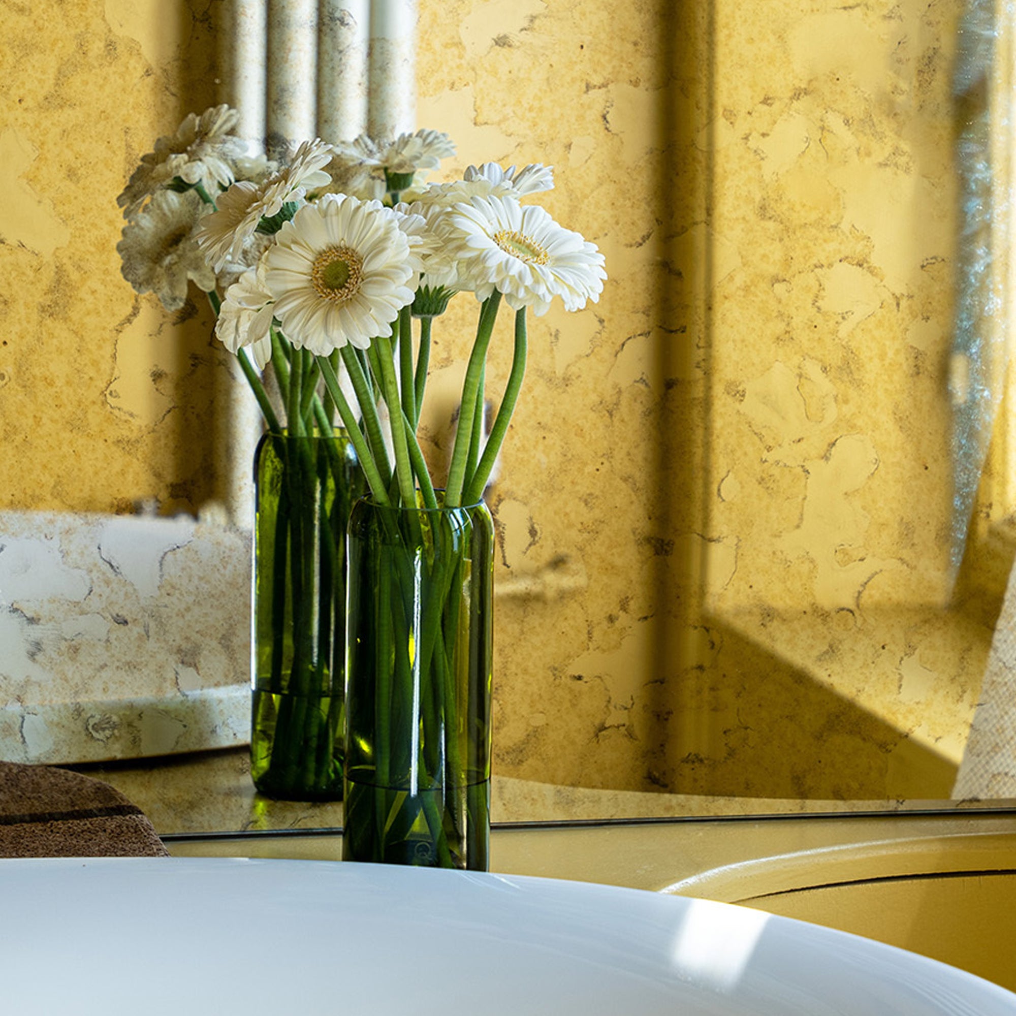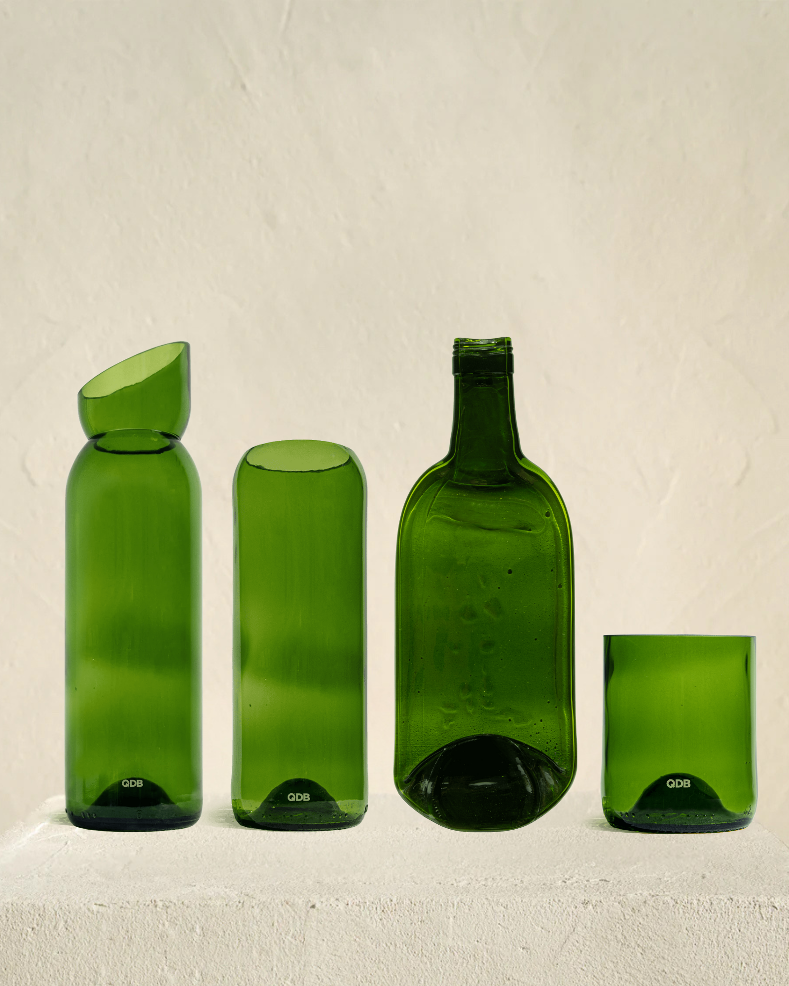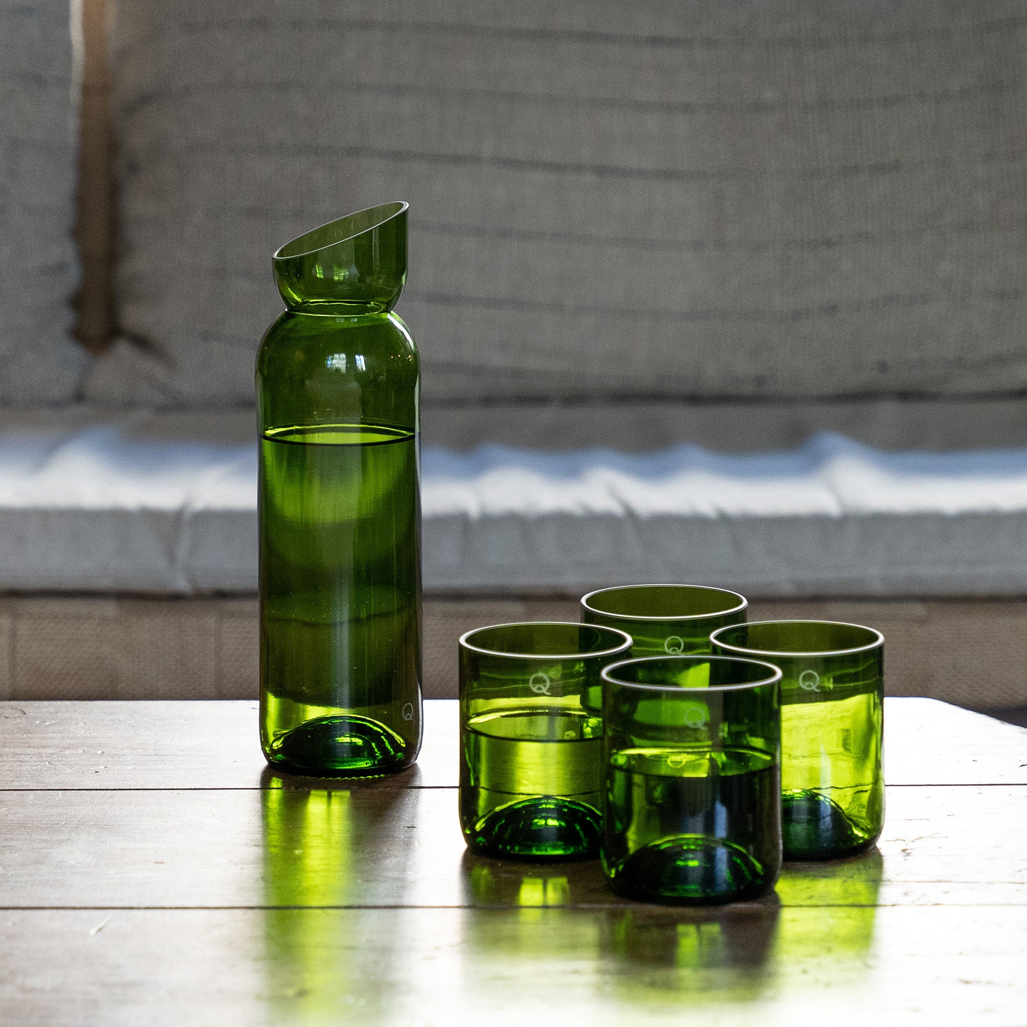 Nous vous proposons un assortiment de nos produits phares dans la teinte verte. Un set monochrome, composé d'une carafe, d'un vase (taille medium), d'une planche apéritive (taille medium) et d'un lot de 4 verres short drink à fond creux.