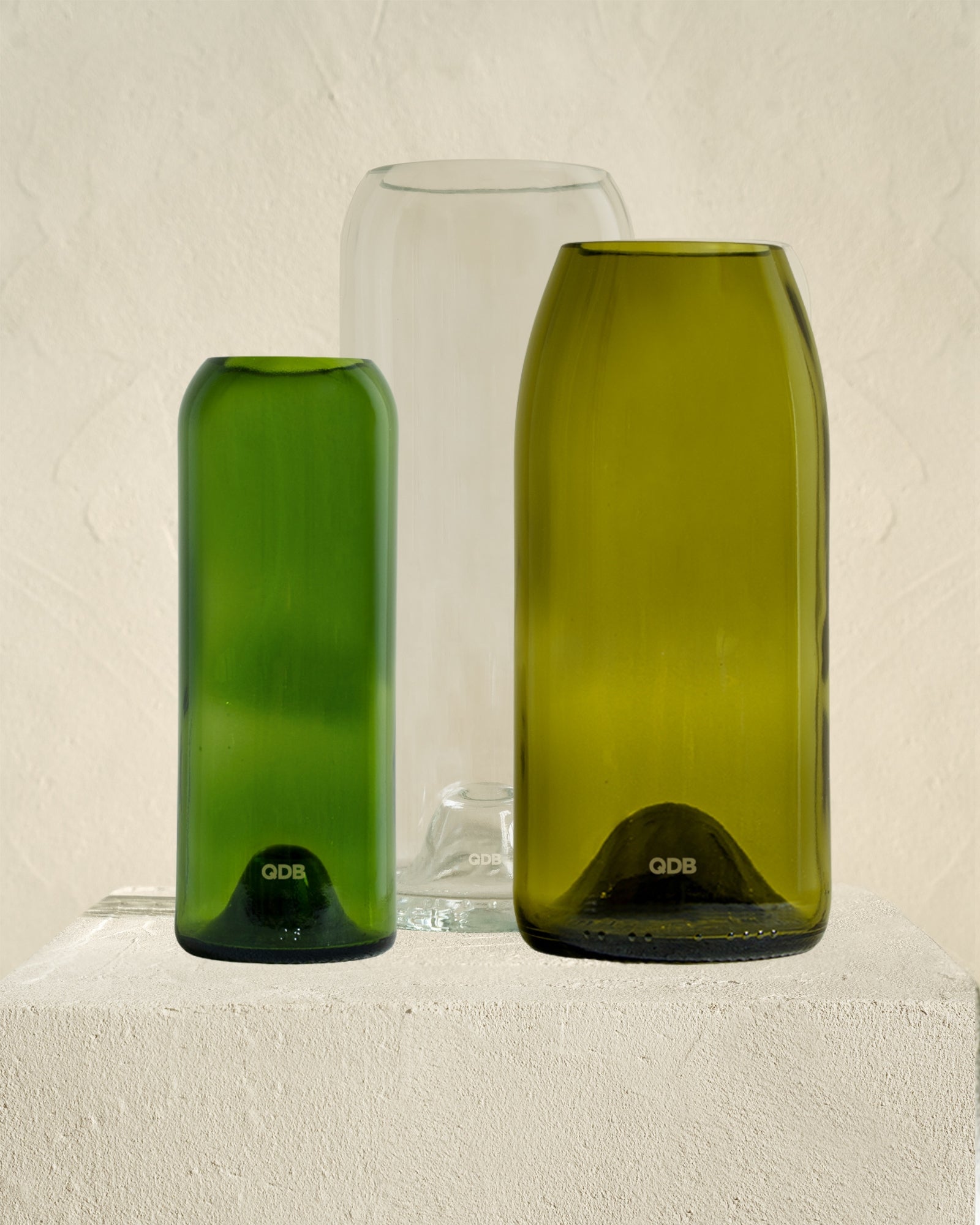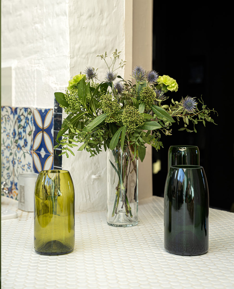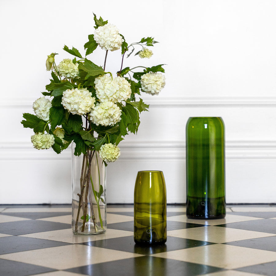 Pour composer ce set, vous devez choisir un vase en taille small (base 37,5cl) + un vase en taille medium (base 75cl) + un vase en taille large (base 150cl). Pour chaque taille, il y a 4 coloris proposés: blanc ou vert à partir de bouteilles bordelaises, feuille morte pour mettre la Bourgogne à l'honneur ou encore vert 02 pour le flacon champenois.