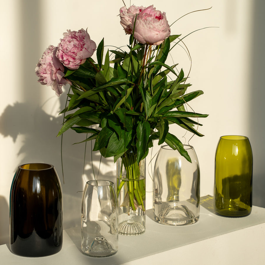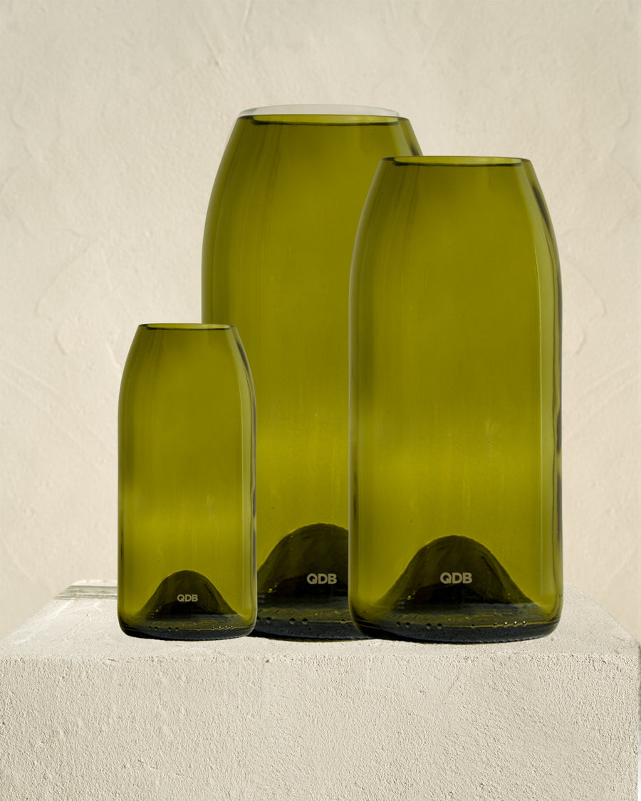 Ce set est composé de 3 vases façonnés à partir d’une bouteille bourguignonne aux nuances de jaune et de brun. Il y a 3 tailles, pour un triptyque parfait: un vase small (base 37,5cl), un vase medium (base 75cl) et un vase large (base 150cl - magnum).