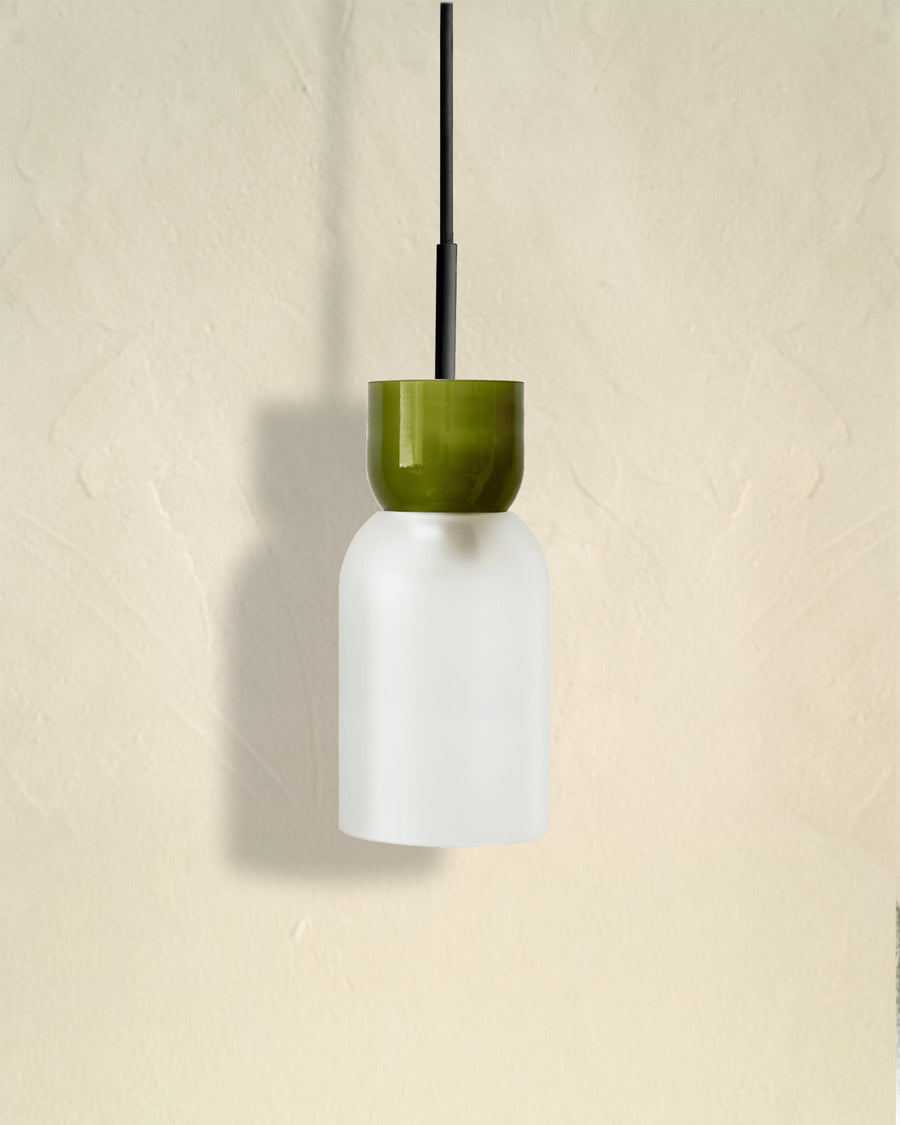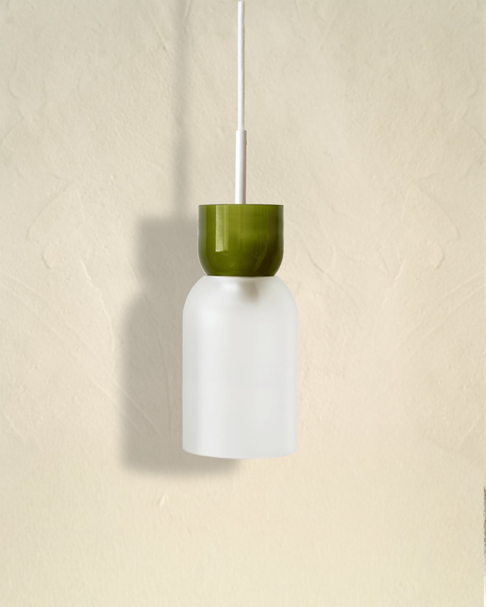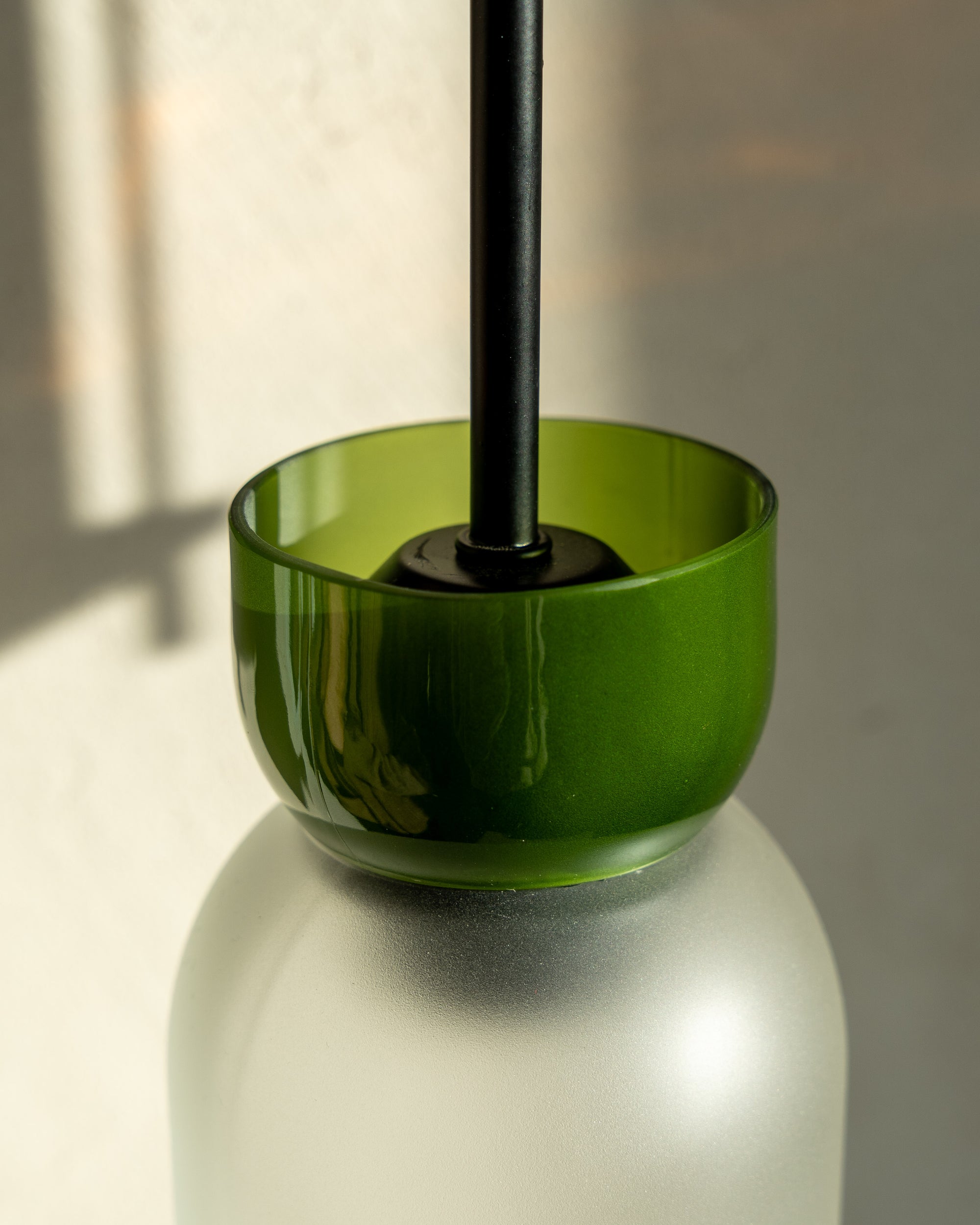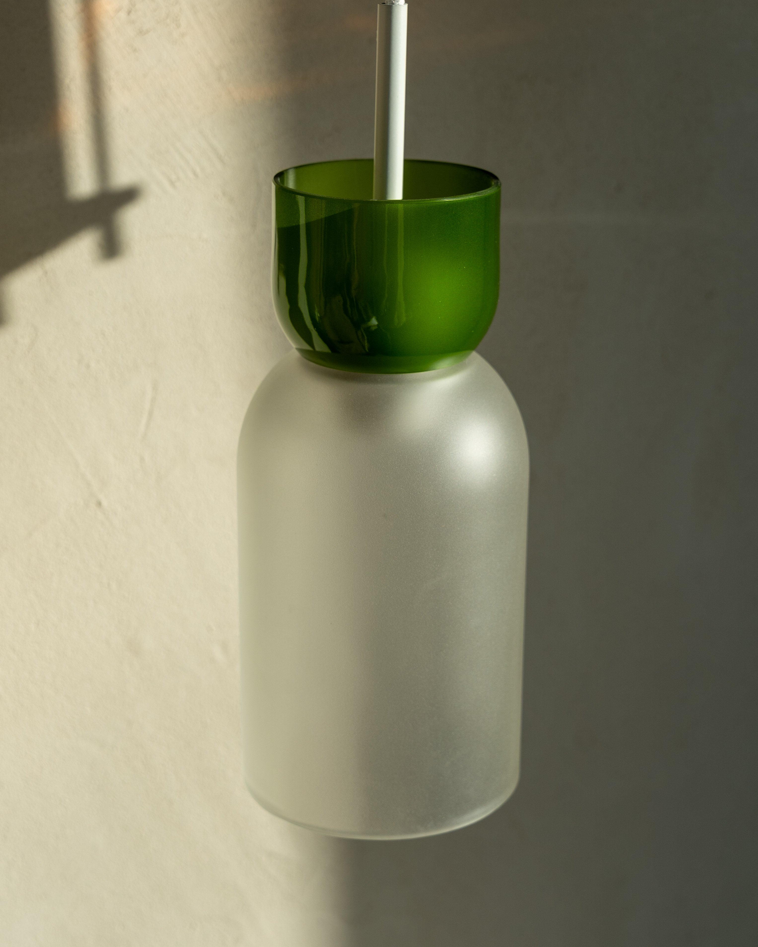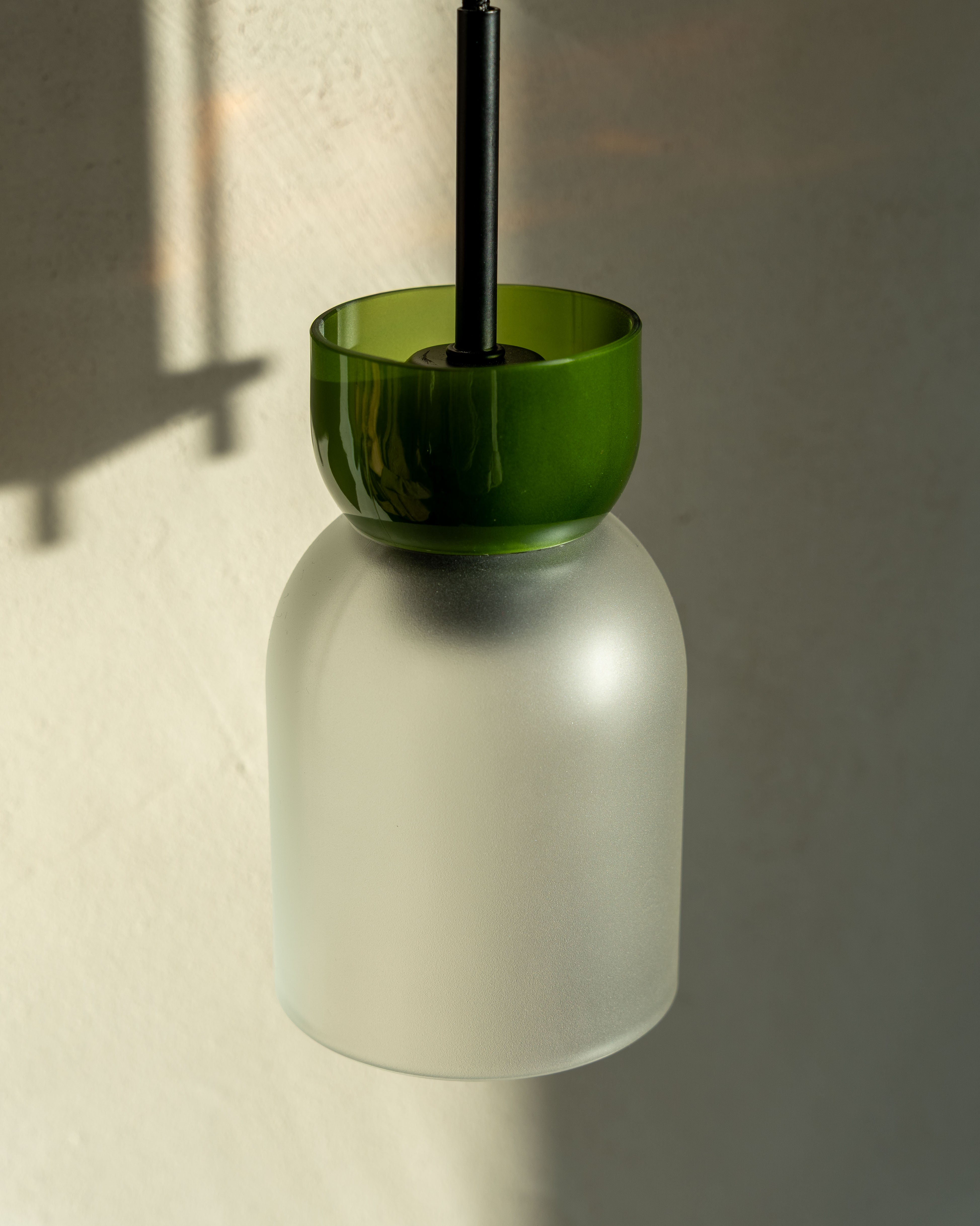 Sous son apparente simplicité, cette suspension naît de gestes minutieux. Chaque création signe la rencontre entre deux cloches - l’une façonnée dans l’épaule d’une bouteille, l’autre sablée dans celui d’un magnum.