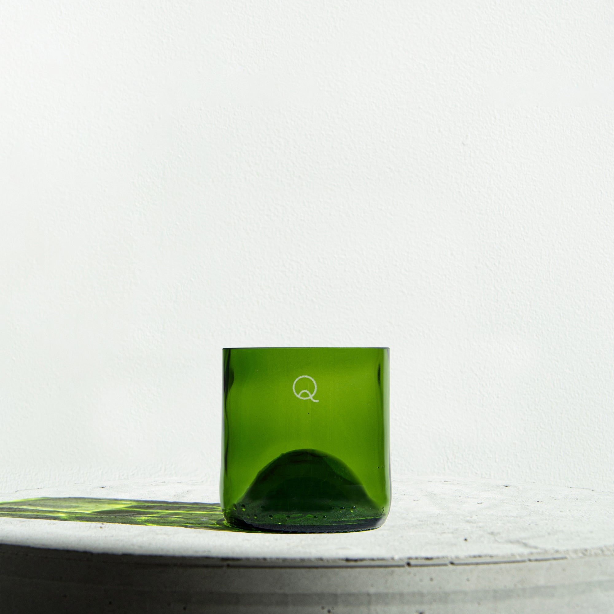 Lot de 4 tasses à café vertes, de second choix. Elles sont façonnées à partir de demi-bouteilles de vin bordelaises.