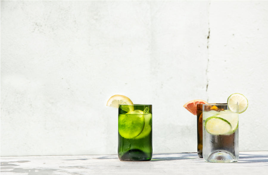 Lot de 4 verres long drink transparents façonnés à partir de bouteilles de vin rosé.