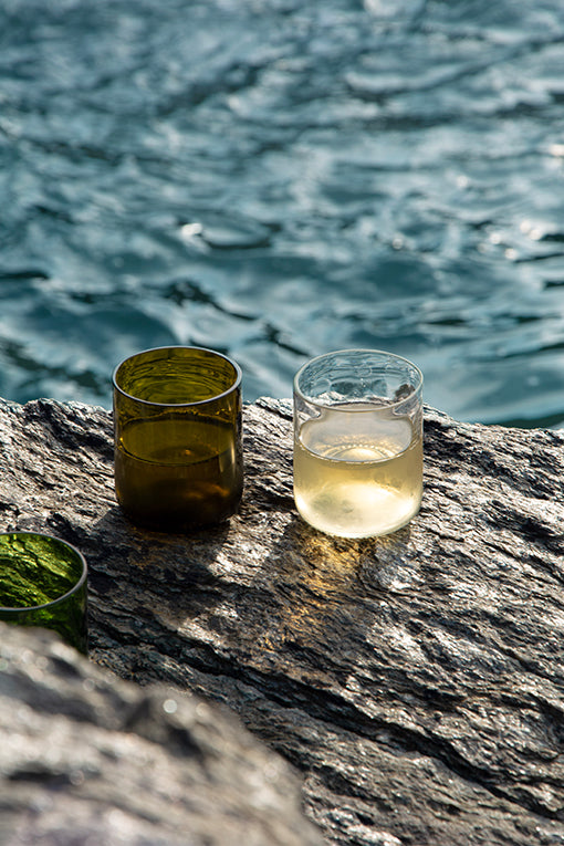 Lot de 4 verres short drink façonnés à partir de bouteilles de vin recyclées.